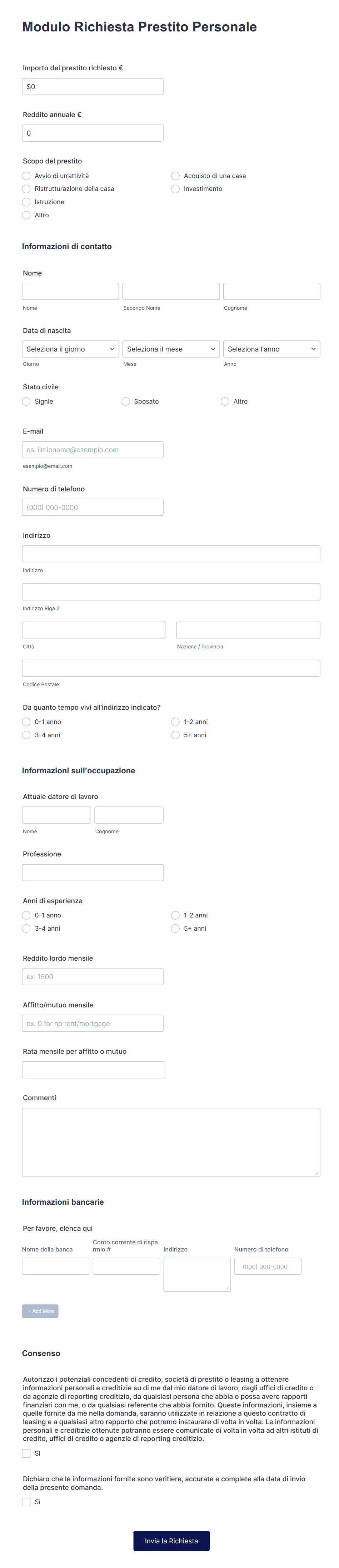 Sia che si tratti di moduli di richiesta per carta di credito, sia di una domanda di prestito per studenti, acquirenti di casa oppure aziende, le banche hanno necessità di un modo semplice per gestire le domande. I template di moduli per l'online banking personalizzabili di Jotform, aiutano le banche di tutto il mondo a raccogliere le informazioni di cui hanno bisogno. Scegli uno dei modelli di modulo bancario dalla nostra collezione con il quale iniziare o creane uno nuovo. Aggiungere un widget o un'applicazione dalla vasta collezione di Jotform, può aiutare a rendere il tuo template bacario più coinvolgente. Coloro i quali stiano cercando di iniziare a creare un modulo, possono sceglierne uno dai nostri modelli di moduli bancari.