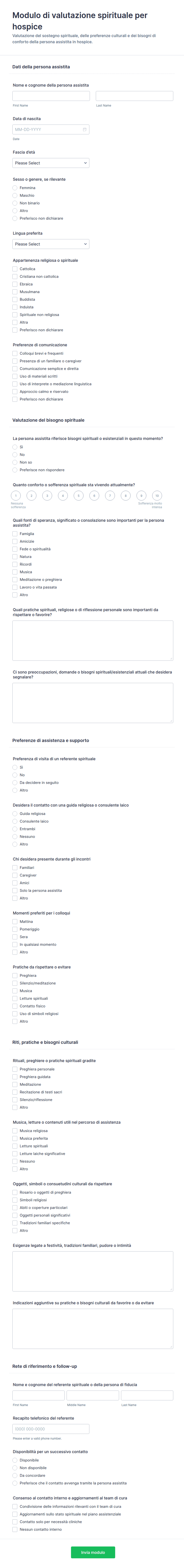 Un modulo per case di cura è un documento digitale o cartaceo utilizzato per raccogliere, organizzare e gestire informazioni relative all'assistenza sanitaria, come l'accoglienza dei pazienti, i piani terapeutici, il consenso e i feedback.