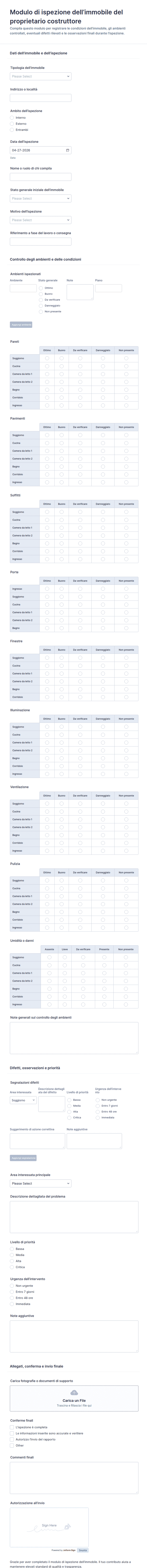 Raccogli e organizza controlli e segnalazioni su immobili in costruzione o in consegna con il Modulo di ispezione dell’immobile del proprietario costruttore di Jotform, utile per imprese, tecnici e responsabili qualità.