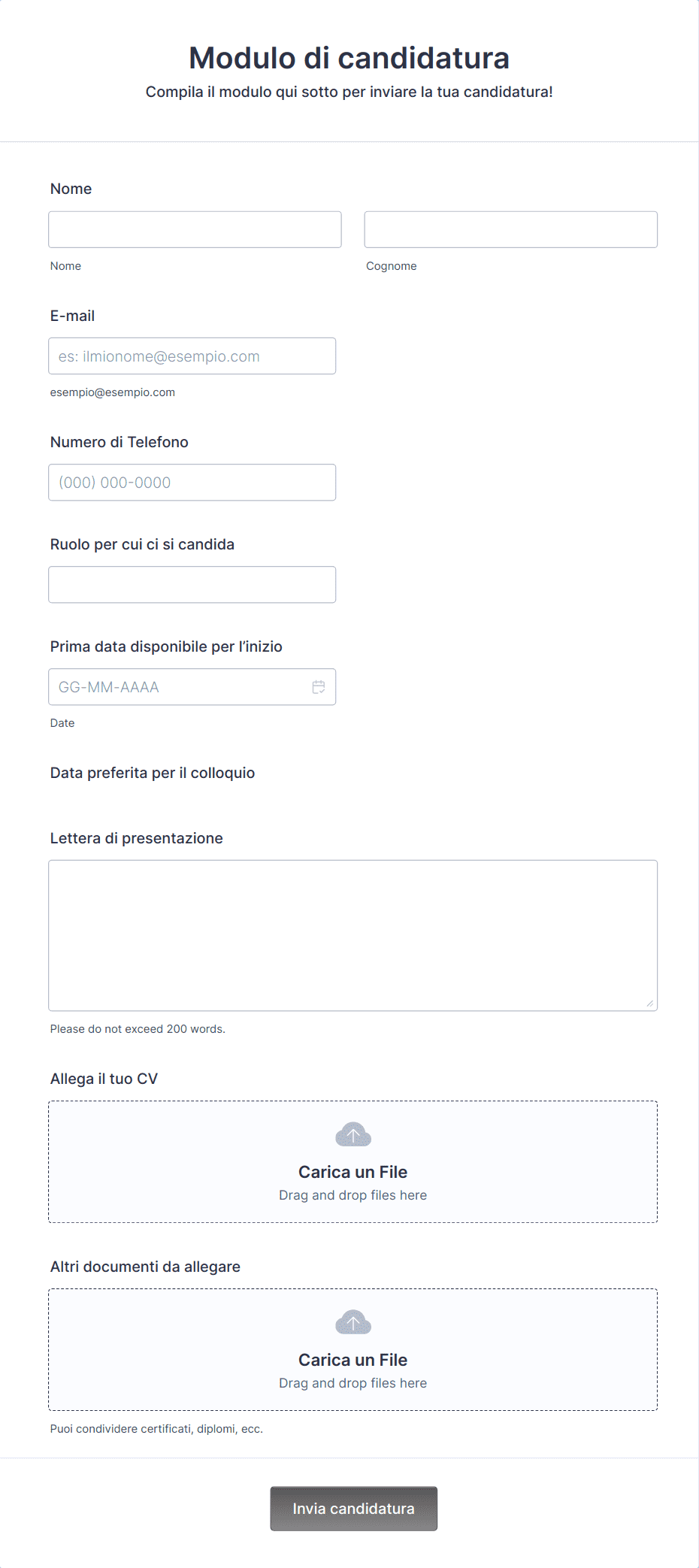 Il Modulo di Candidatura consente di raccogliere online tutte le informazioni necessarie sui candidati, dal curriculum ai dati di contatto, in modo rapido e sicuro. Perfetto per aziende e professionisti che vogliono semplificare le assunzioni.