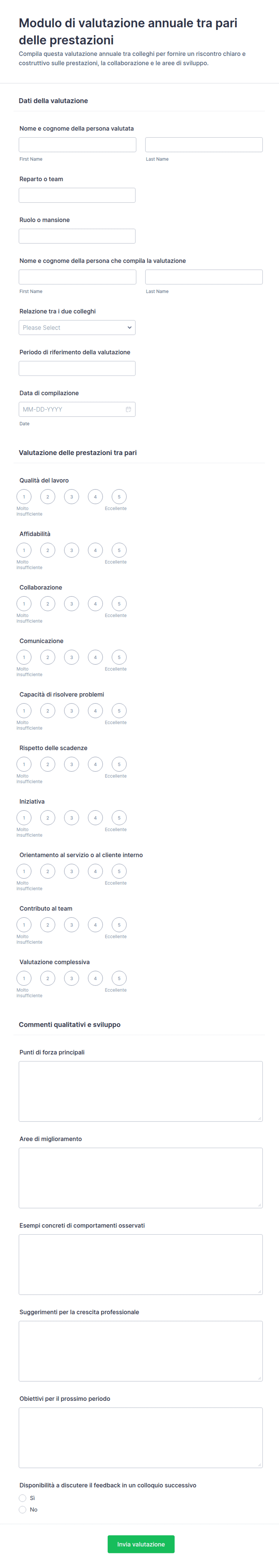 - Sviluppo Professionale: I moduli possono includere sezioni di autovalutazione e commenti dei colleghi per incoraggiare la riflessione.