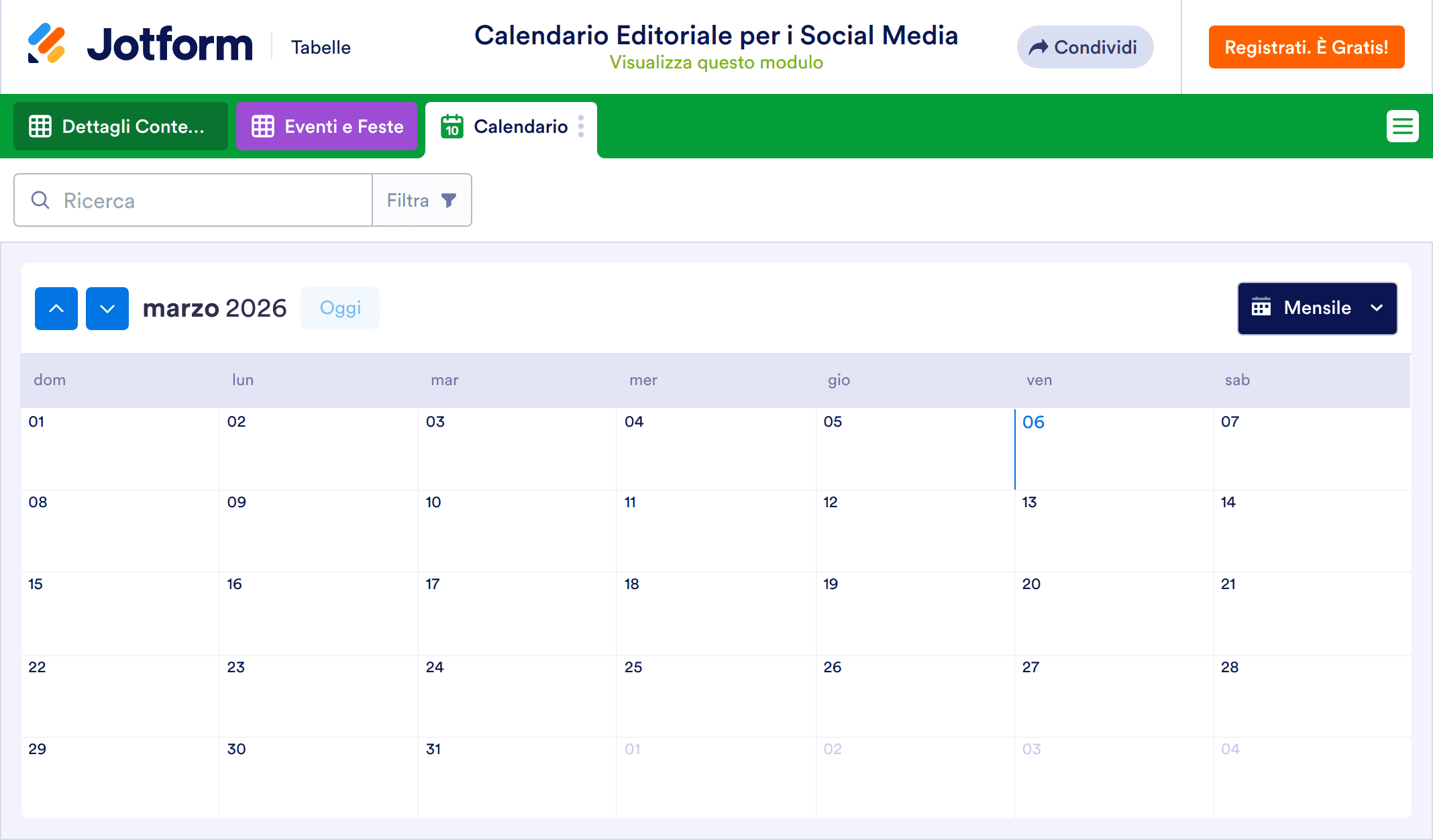 Un calendario editoriale per i social media ti permette di pianificare e programmare in anticipo i post da pubblicare. Che tu sia un blogger, un influencer o un social media manager, fai diventare il tuo brand il prossimo argomento di tendenza con il nostro modello gratuito di Calendario Editoriale per i Social Media. Basta compilare il modulo inserendo i post da pubblicare, indicando social, data e ora. Tutti i contenuti saranno organizzati e consultabili facilmente nella tabella delle risposte, scegliendo la vista che preferisci, tra tabella o calendario, da qualsiasi dispositivo e condivisibili con il tuo team.
