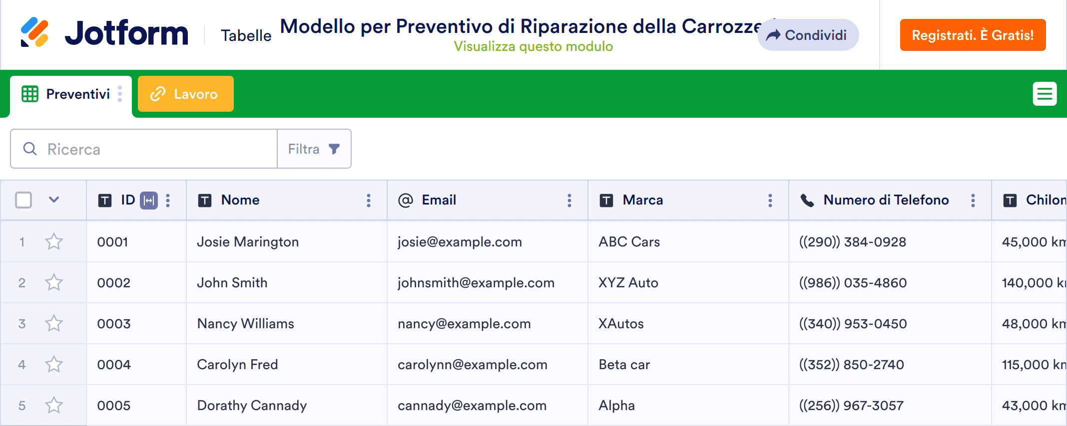 Se desideri personalizzare l'aspetto di questo Modello per Preventivo di Riparazione della Carrozzeria aggiornando righe o colonne, modificando i nomi e i colori delle etichette o aggiungendo nuove schede per organizzare le informazioni in un modo diverso, fallo in un paio di clic con la nostra semplice interfaccia facile da usare. E se desideri sommare i totali, puoi utilizzare la nostra funzione di calcolo per farlo automaticamente, senza bisogno di eseguirli manualmente! Indipendentemente dalle dimensioni della tua officina, puoi tenere traccia dei preventivi di riparazione auto dei clienti e gestirli online con questo Modello per Preventivo di Riparazione della Carrozzeria gratuito.