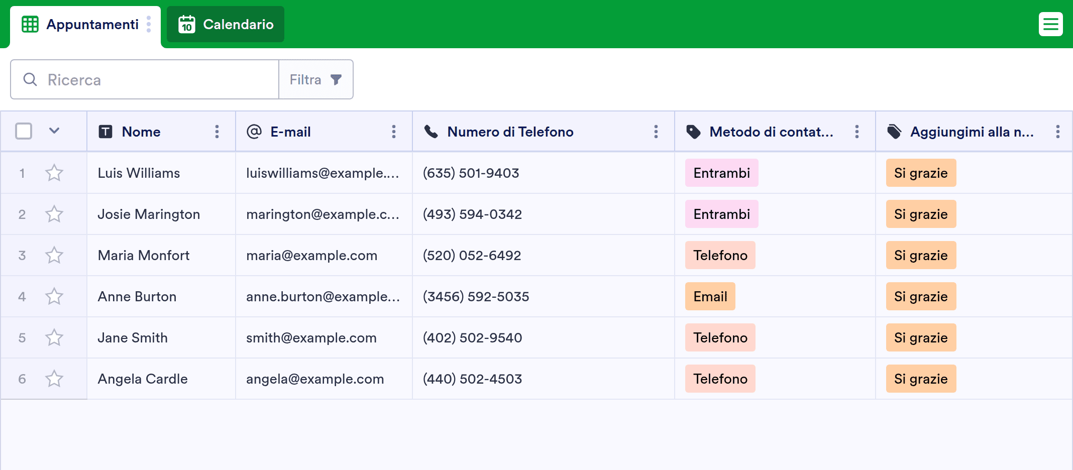 Tu e il personale del tuo salone lavorate duramente per soddisfare ogni cliente, quindi perché non rendere la vostra Scheda di Registrazione al Salone adatta a voi? Non c'è bisogno di sporcarsi le mani, basta trascinare e rilasciare per aggiungere righe, colonne, schede, etichette e altro ancora. Puoi anche passare dalla visualizzazione foglio di calcolo a cartolina o calendario per visualizzare le tue informazioni nel modo più adatto a te! Con una Scheda di Registrazione al Salone personalizzata che organizza ordinatamente le informazioni sugli appuntamenti, non vorrai mai più strapparti i capelli!