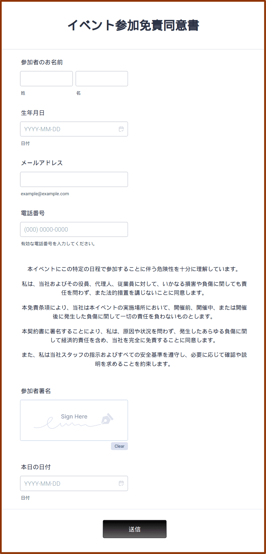 これらのテンプレートは、あくまでも提案書式です。このフォームを契約書やその他の法的文書として使用する場合は、事前に弁護士に相談し、法的ニーズや状況に適合していることを確認してください。このフォームをJotformへの法的な依頼に使用しないでください。