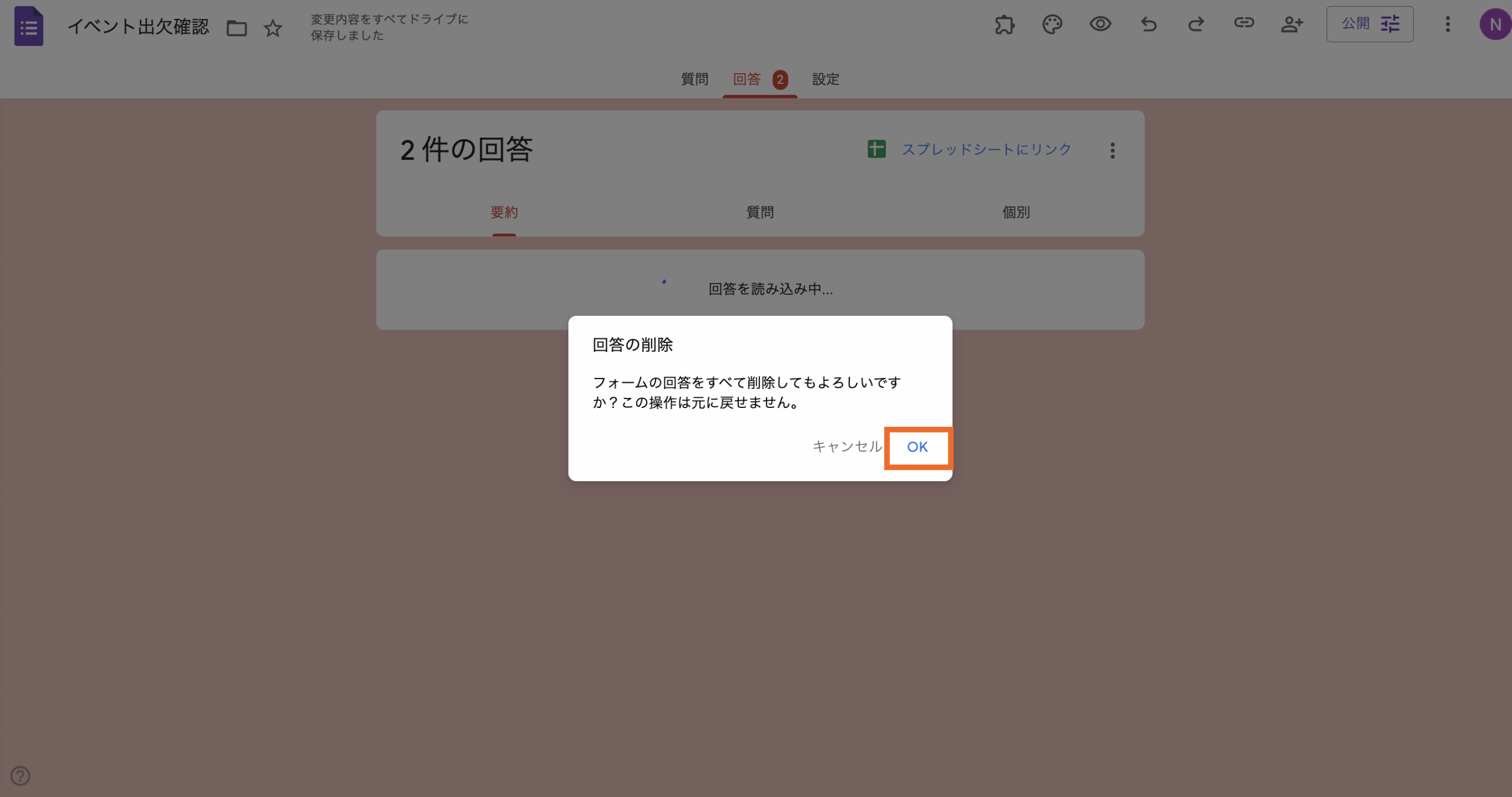 - すべての回答を削除するか確認するポップアップが表示されます。OKをクリックします。