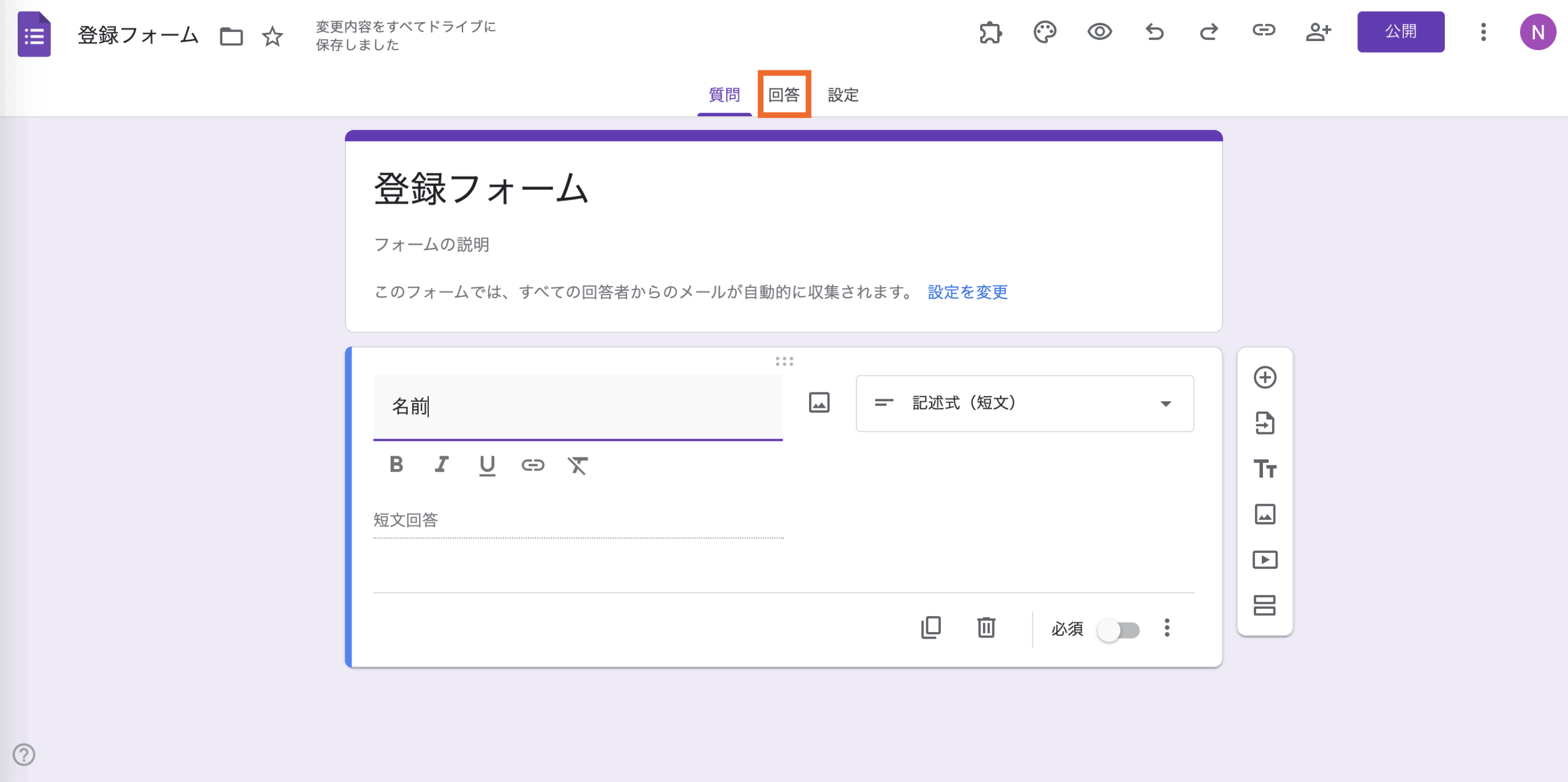 - フォームが開いたら、フォームの上部にある回答タブをクリックします。