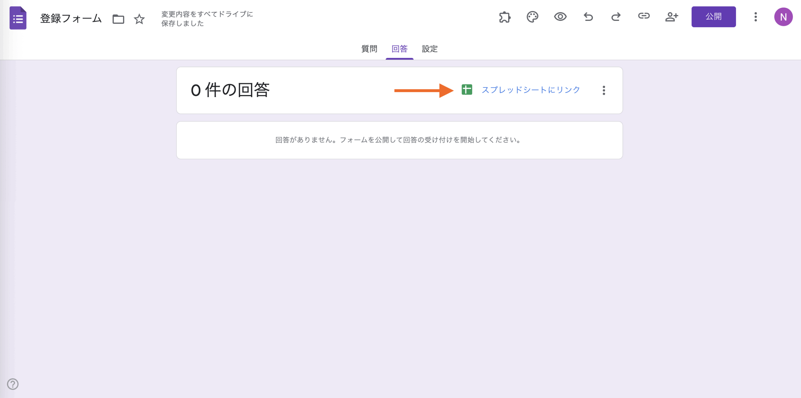 - 回答タブで、シートにリンクをクリックして、フォームをGoogleスプレッドシートに接続します。