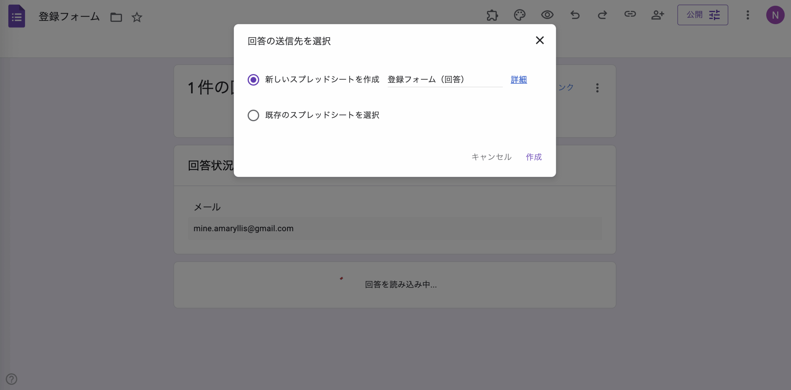 - このフォーム用のスプレッドシートがまだ存在しない場合は、新しいスプレッドシートを作成オプションを選択し、スプレッドシートの名前を入力して作成をクリックします。スプレッドシートがすでに存在する場合は、既存のスプレッドシートを選択をクリックし、選択をクリックして開きたいスプレッドシートを選びます。