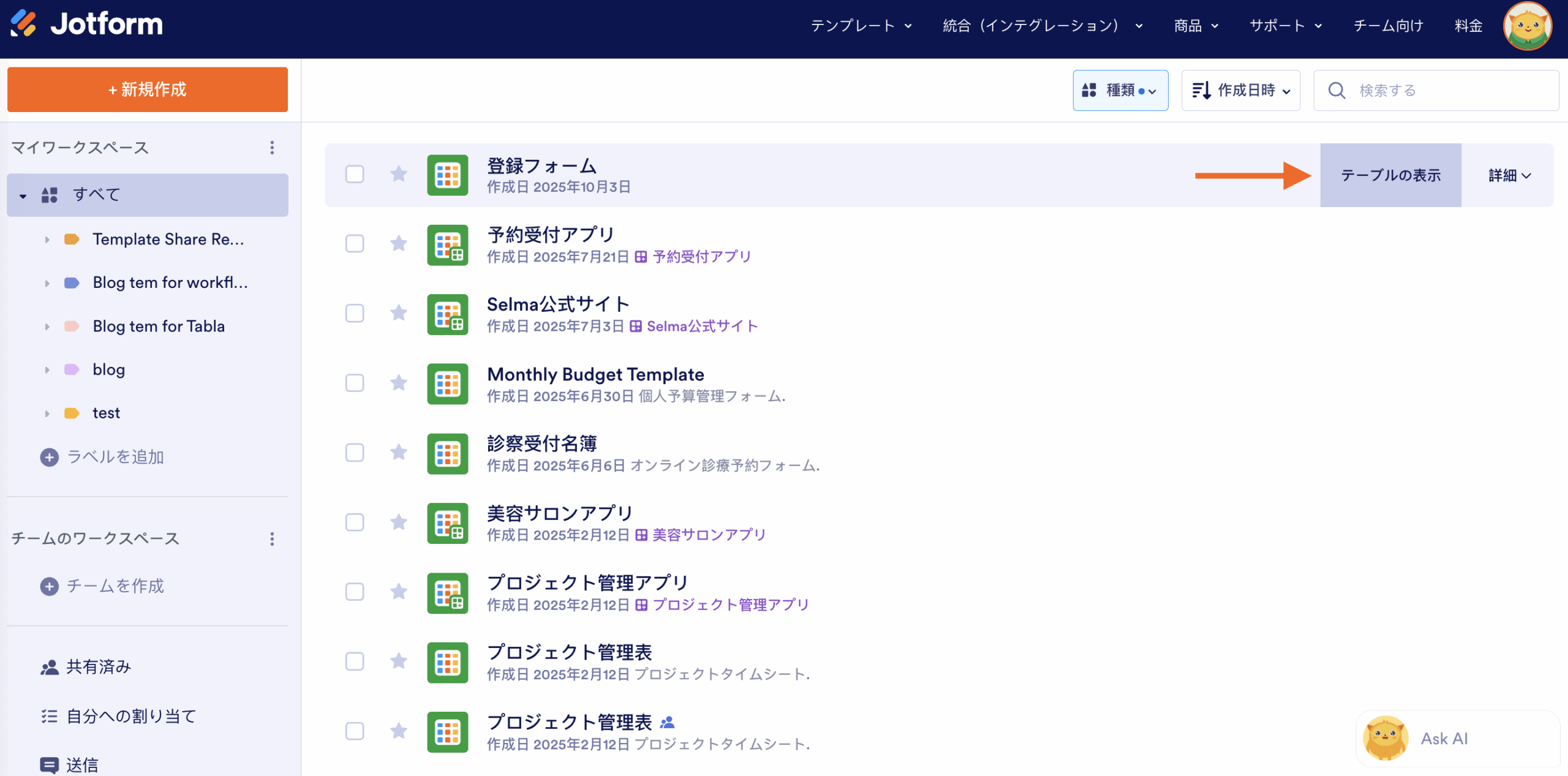 - Jotformテーブルを開き、フォームに関連付けられたテーブルを選択します。次にテーブルを表示をクリックして、テーブルを開きます。