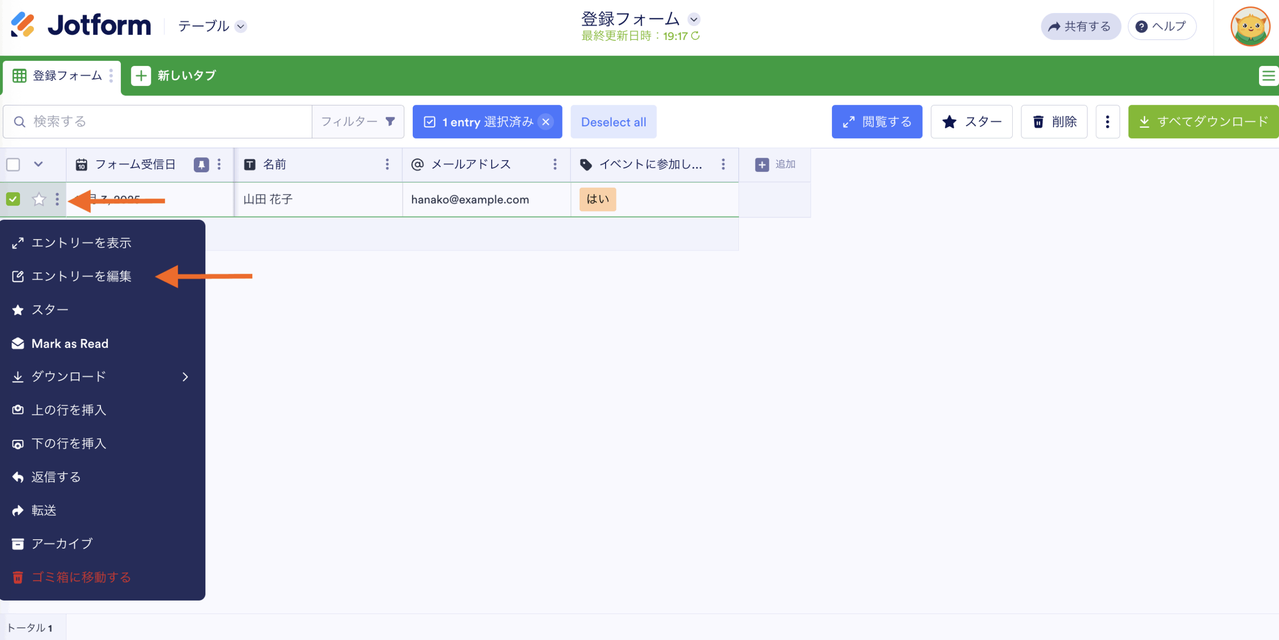 - 編集したいエントリーの一番左の列にある、星のアイコンの隣にある三つの縦の点をクリックして、エントリーメニューを開きます。次に、エントリーの編集オプションをクリックして、そのフォームの回答者の回答を編集します。