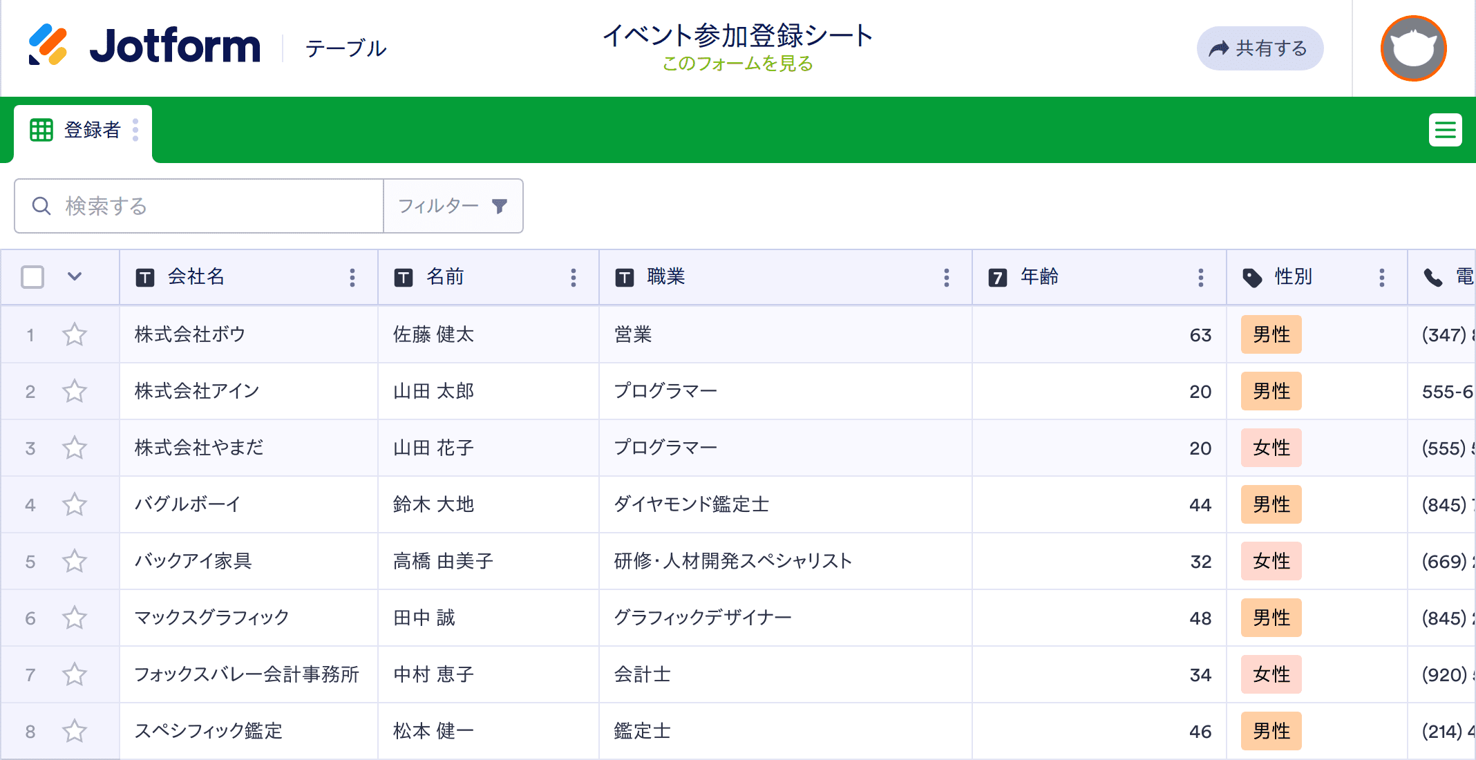 この無料のイベント参加登録シートテンプレートを使えば、イベントの申込プロセスをオンラインで効率的かつ専門的に管理できます。添付のオンライン登録フォームを共有するだけで、参加者はどのデバイスからでも入力可能。フォームから送信された情報は自動的にテーブルに反映され、連絡先の管理・登録状況の追跡・予算管理まで、プロ仕様のオンラインテーブルで簡単に行えます。