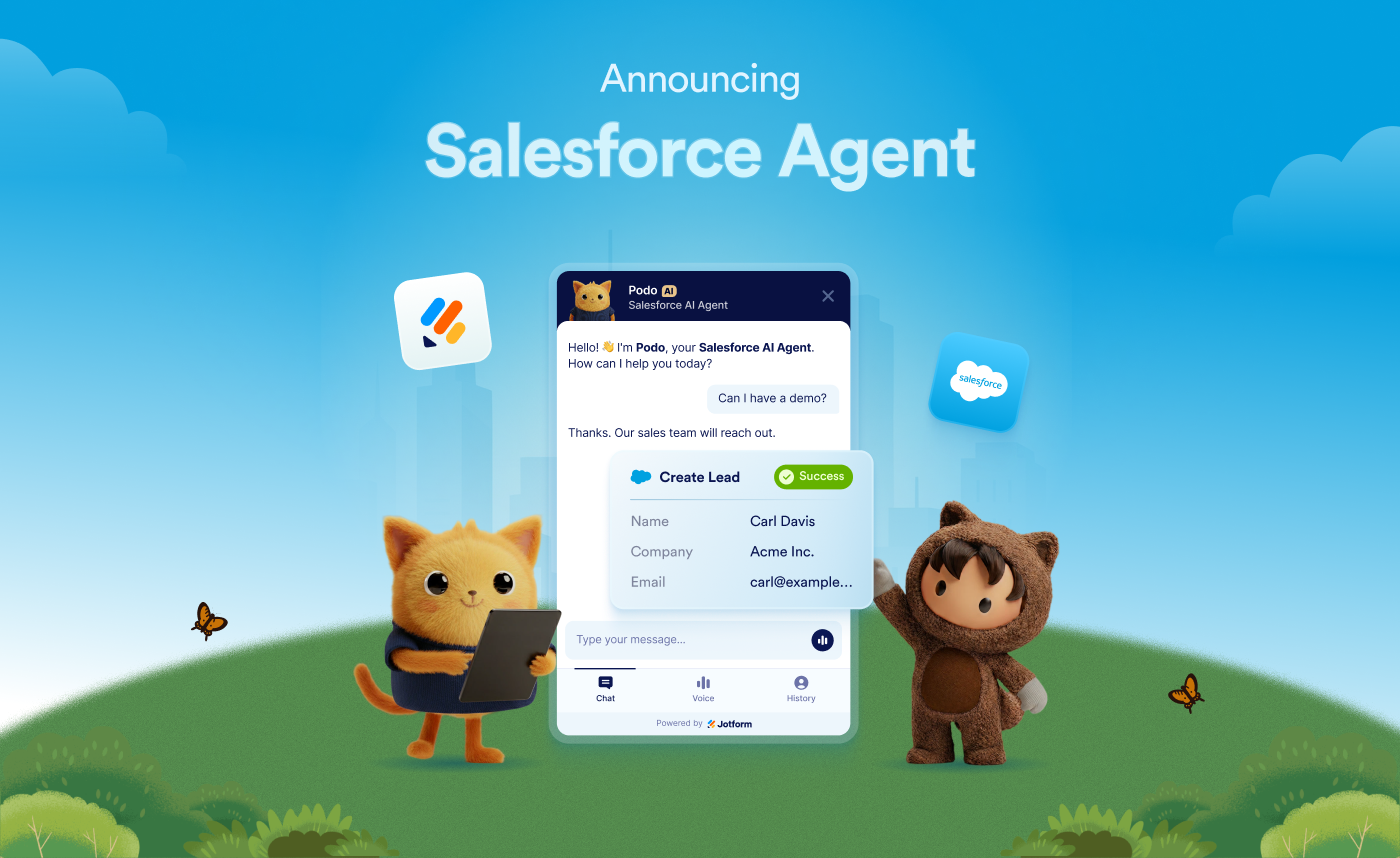 Say hello to Jotform’s Salesforce Agent, your AI Chatbot for Salesforce.