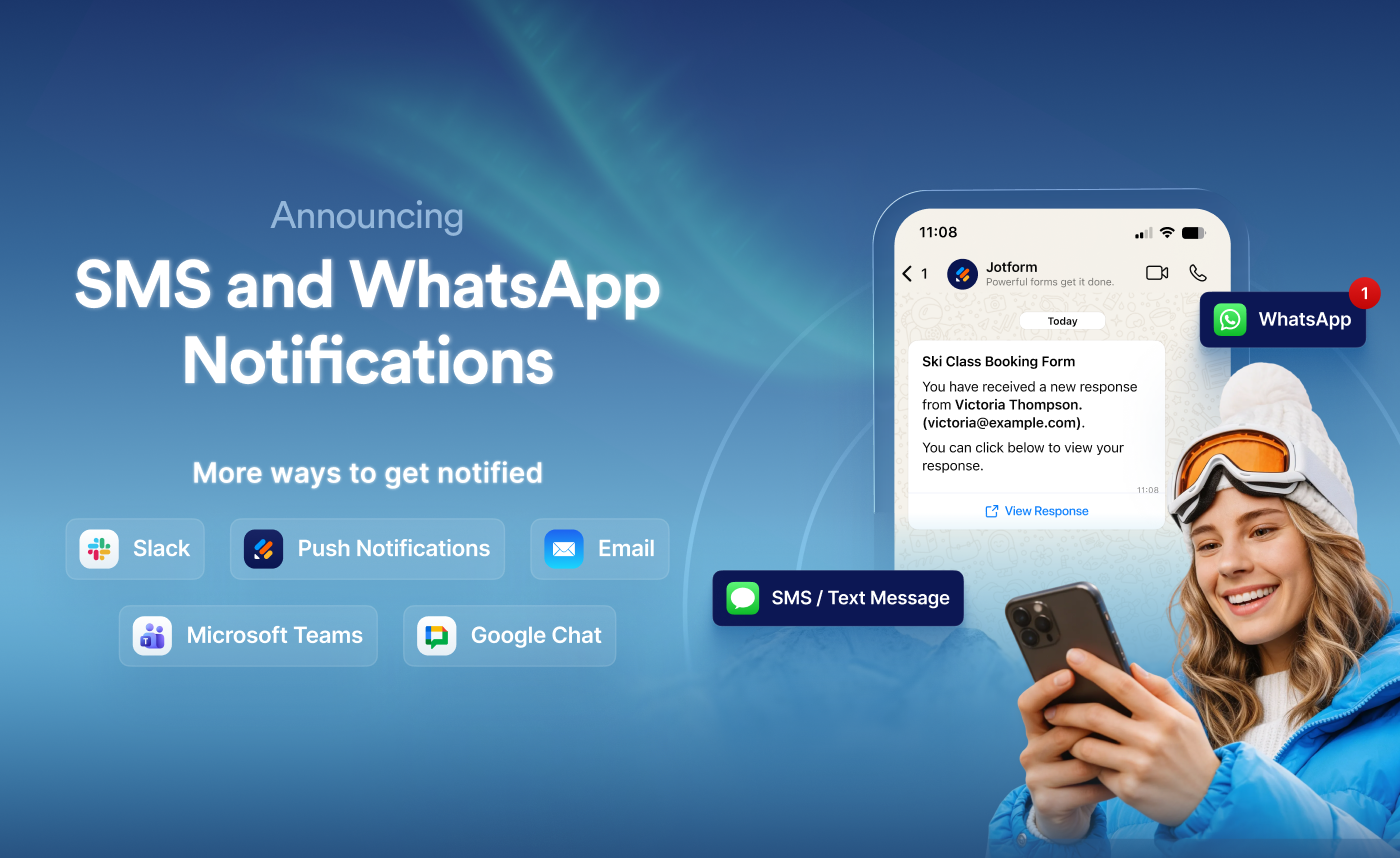 Users are buzzing because we’re introducing Jotform Notifications: a unified notification system — now including WhatsApp and SMS — to bring all your submission alert options together in one place. Get ready to receive instant form notifications through your preferred channel, whether you’re on the go or at your desk.