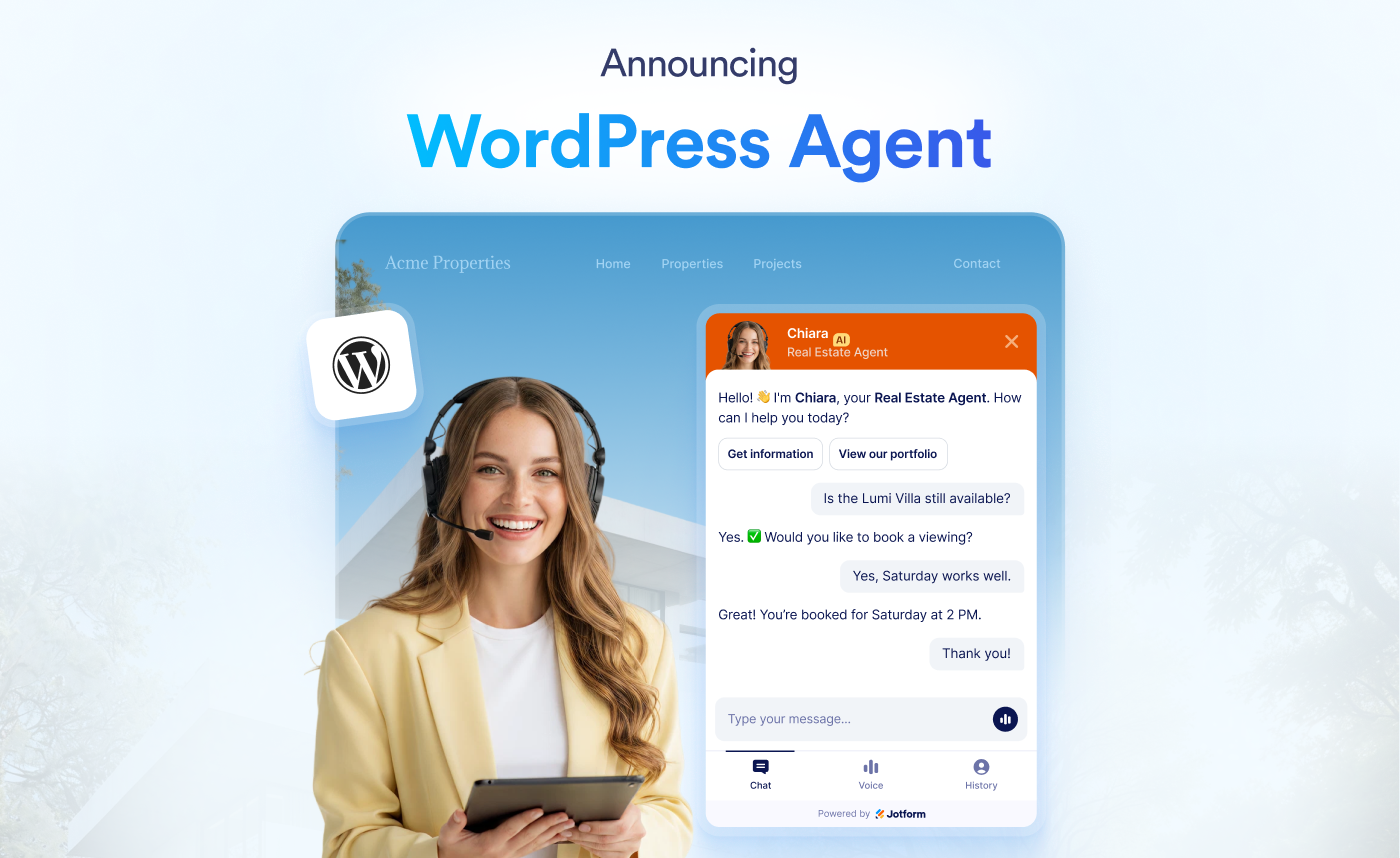 Meet Jotform’s WordPress Agent, your new favorite AI chatbot plugin for your WordPress site.
