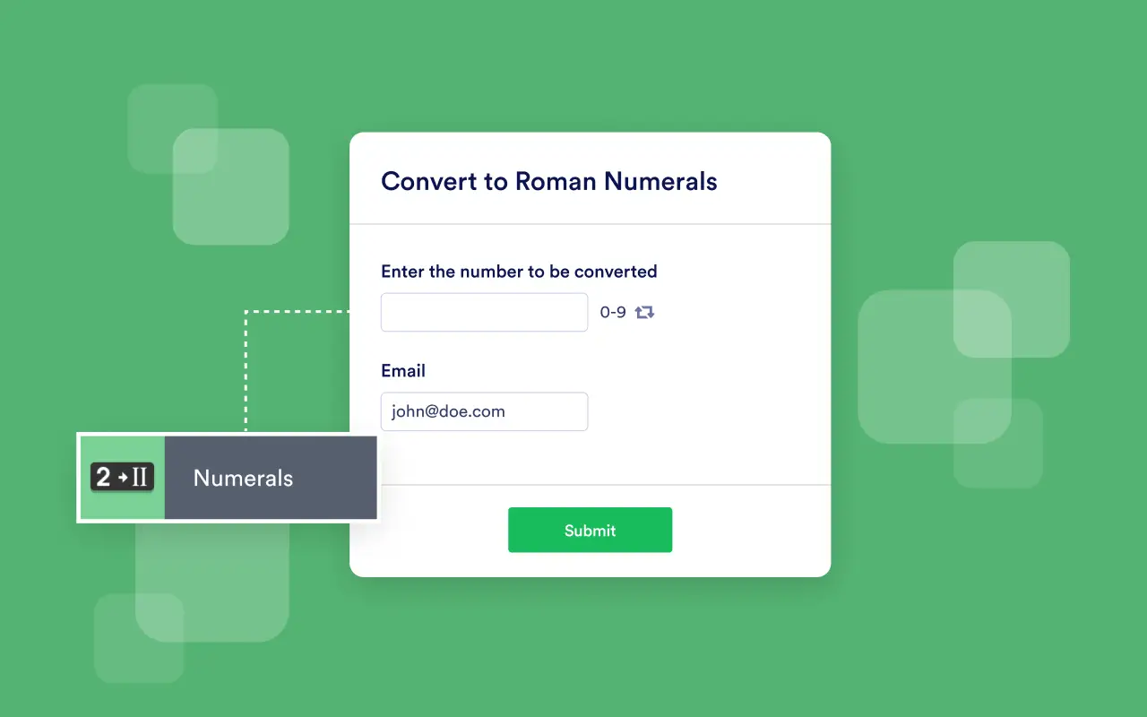 Use this free Numerals widget from Jotform to let users convert numbers into Roman or Thai numerals. To switch between the various numeral translations, simply select the widget’s refresh button. When users submit their responses, all the translated results will be submitted.