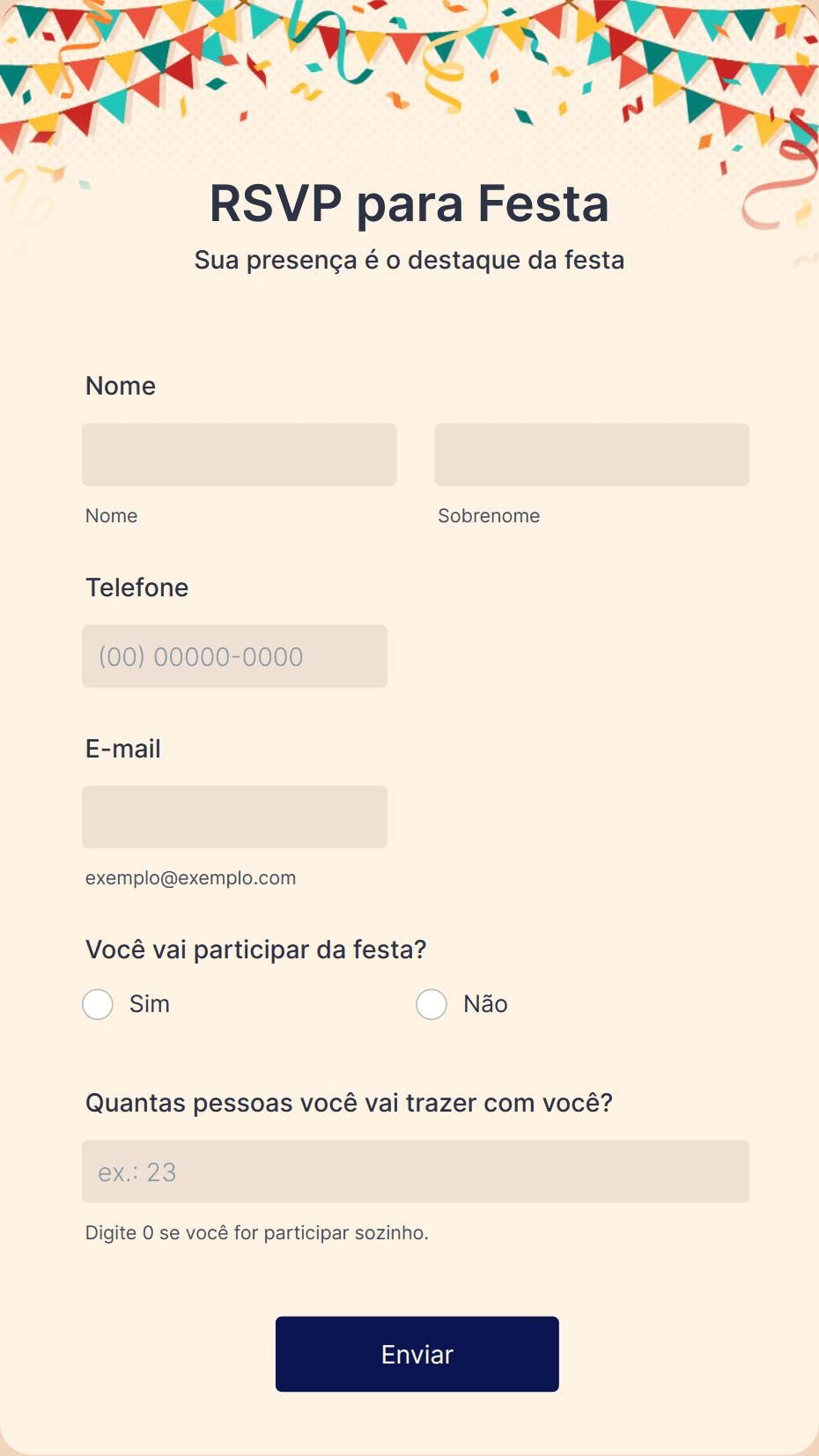 Os formulários para confirmação de presença são ferramentas digitais criadas para coletar respostas dos convidados sobre sua participação em eventos, encontros, reuniões ou ocasiões especiais. Seja para organizar um casamento, seminário corporativo, festa de aniversário ou evento comunitário, esses formulários agilizam o processo de confirmação de presença, reunindo informações essenciais, como preferências de refeição, acompanhantes ou necessidades especiais. Eles ajudam os organizadores a gerenciar a contagem de convidados de forma eficiente, planejar a logística e garantir uma experiência tranquila para anfitriões e participantes. A versatilidade dos formulários para confirmação de presença permite que sejam adaptados para galas formais, encontros informais, webinars virtuais ou até mesmo reuniões periódicas de clubes.
