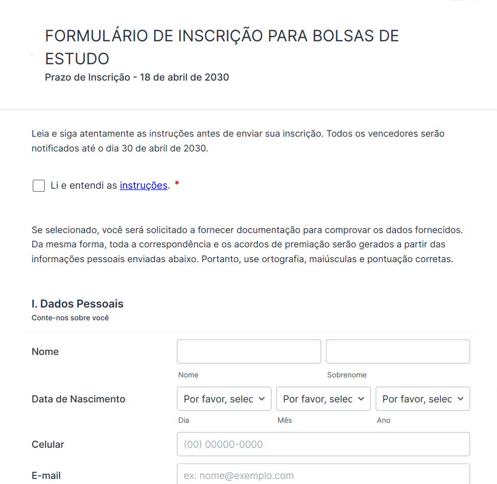 Formulários para candidaturas são ferramentas essenciais usadas para coletar informações de indivíduos ou organizações que desejam se inscrever em algo — seja um emprego, uma bolsa de estudos, uma associação, um empréstimo ou a participação em um evento ou programa. Esses formulários padronizam o processo de inscrição, garantindo que todos os candidatos forneçam os detalhes necessários para uma avaliação justa e eficiente. Os formulários para candidaturas podem ser adaptados para uma ampla variedade de situações, desde oportunidades de emprego e voluntariado até admissões escolares, pedidos de bolsas, contratos de aluguel e muito mais. Sua versatilidade os torna indispensáveis para empresas, instituições de ensino, organizações sem fins lucrativos e órgãos governamentais.