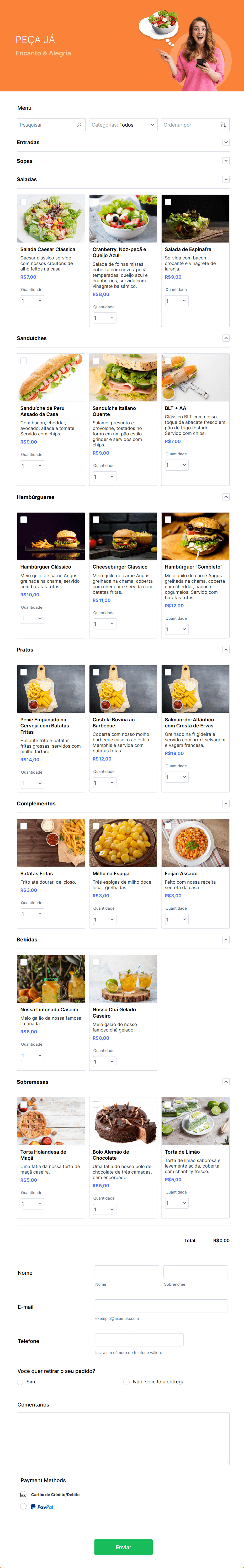 - Para pedidos de serviços, inclua campos como seletores de data/horário, menus suspensos para tipos de serviço e campos de texto para instruções especiais.