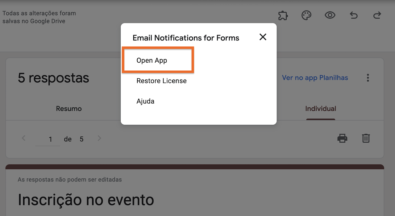 - Acesse seu formulário e clique no ícone de complementos (quebra-cabeça). Clique em Email Notification for Google Forms e depois em Open App.