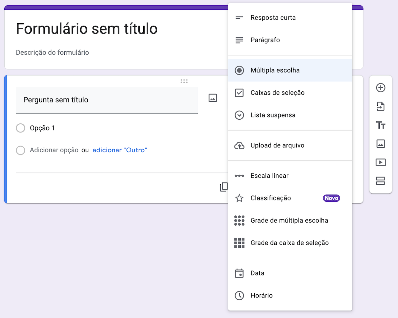Para alterar o tipo de pergunta, clique no menu suspenso à direita da pergunta. Uma lista de tipos de pergunta aparecerá, como múltipla escolha, resposta curta, caixas de seleção, entre outros. Escolha a opção que melhor atende às suas necessidades.