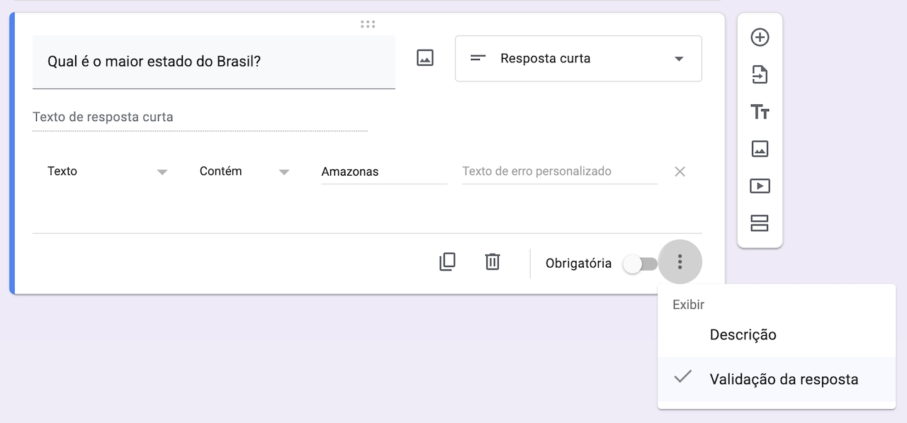 Ative a validação de respostas clicando nos três pontos no canto inferior direito da pergunta e selecionando Validação da resposta. A partir daí, você pode especificar se a resposta correta é um número ou texto. Você também pode simplesmente estipular que deve ter mais ou menos de um comprimento específico.
