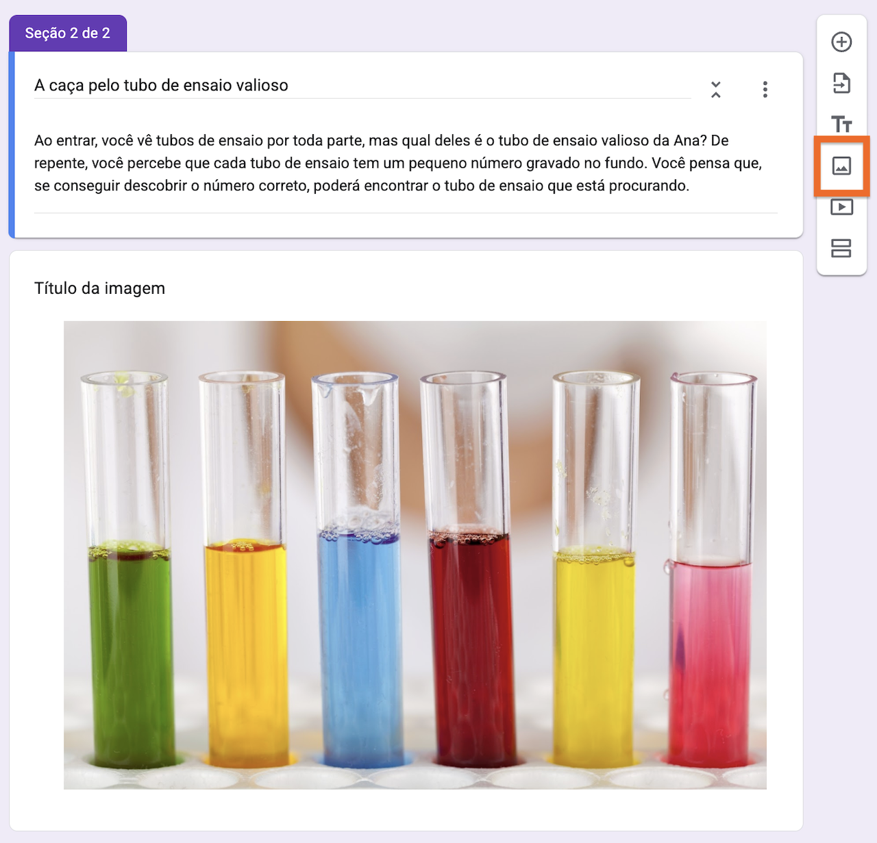 - Aprimorando suas perguntas. Você pode aprimorar ainda mais suas perguntas com vários recursos. A barra lateral (visível na imagem anterior) permite inserir um título, uma descrição, imagens e vídeos, além de adicionar novas seções. Seções podem ser úteis para criar uma série de perguntas que fornecem ao aluno um único código. Uma vez que eles completem um código — terminando a seção atual — você pode dirigi-los para a próxima seção ou, se for o final do escape room, enviar o formulário.