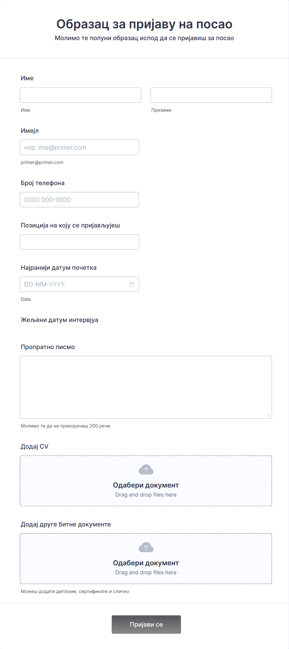 Обрасци за људске ресурсе су документи које одељење за људске ресурсе компаније користи за запошљавање и управљање запосленима. Са Jotform-овим онлајн шаблонима за људске ресурсе, твоје одељење за људске ресурсе може да управља информацијама о запосленима, верификацији запослења, задовољству запослењем, пријавама за посао и захтевима за слободно време. Започни тако што ћеш изабрати шаблон испод.