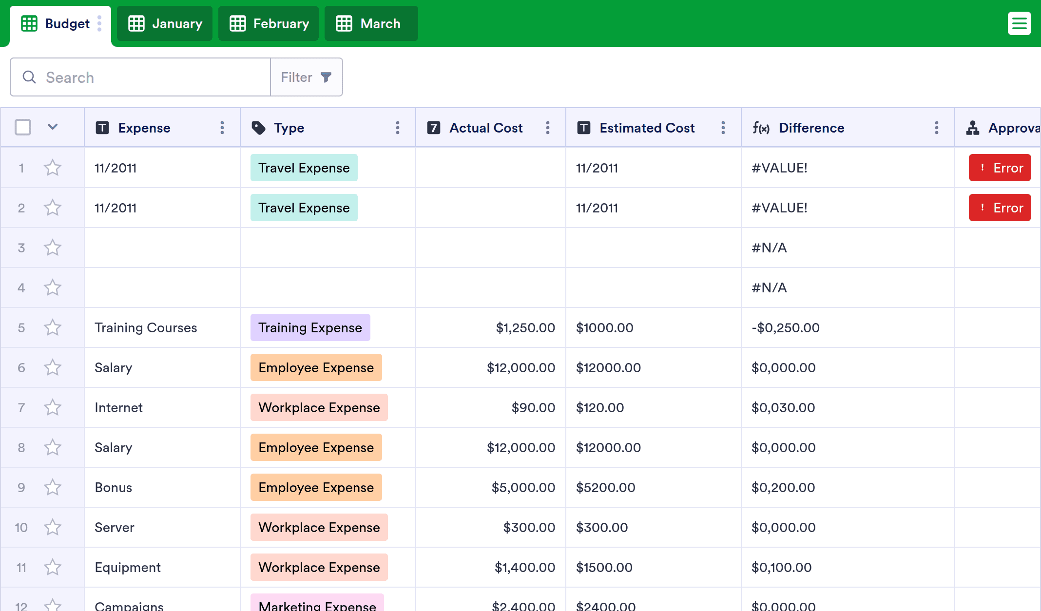 Take care of business with this free online Business Budget Table! Manage and track your expenses more efficiently with Jotform Tables, an easy-to-use database-spreadsheet hybrid. To get started, simply enter your budget through the attached form or directly to the Business Budget Table in order to manage and efficiently track your expenses. In just a few clicks, you can create new columns, rows, and color-coded labels, add tabs for different months, and set up formulas to perform instant calculations automatically.