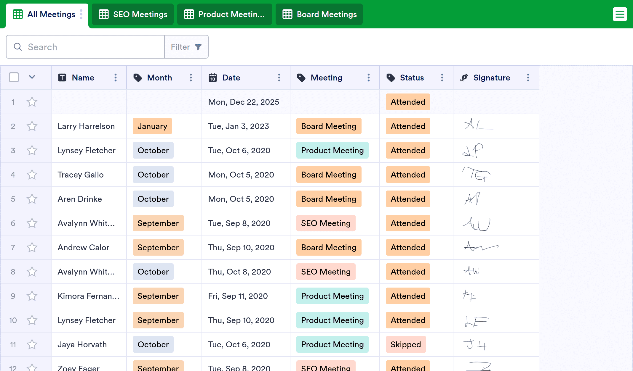 Easily track employee attendance at your company meetings with a free online Meeting Attendance Sheet! By quickly entering attendance details in this professional digital spreadsheet, you can store and monitor company-wide attendance records without any coding — perfect for HR departments, secretaries, managers, and more. You can even download your Meeting Attendance Sheet as a CSV, PDF, or Excel document to keep an offline hard copy for your records!