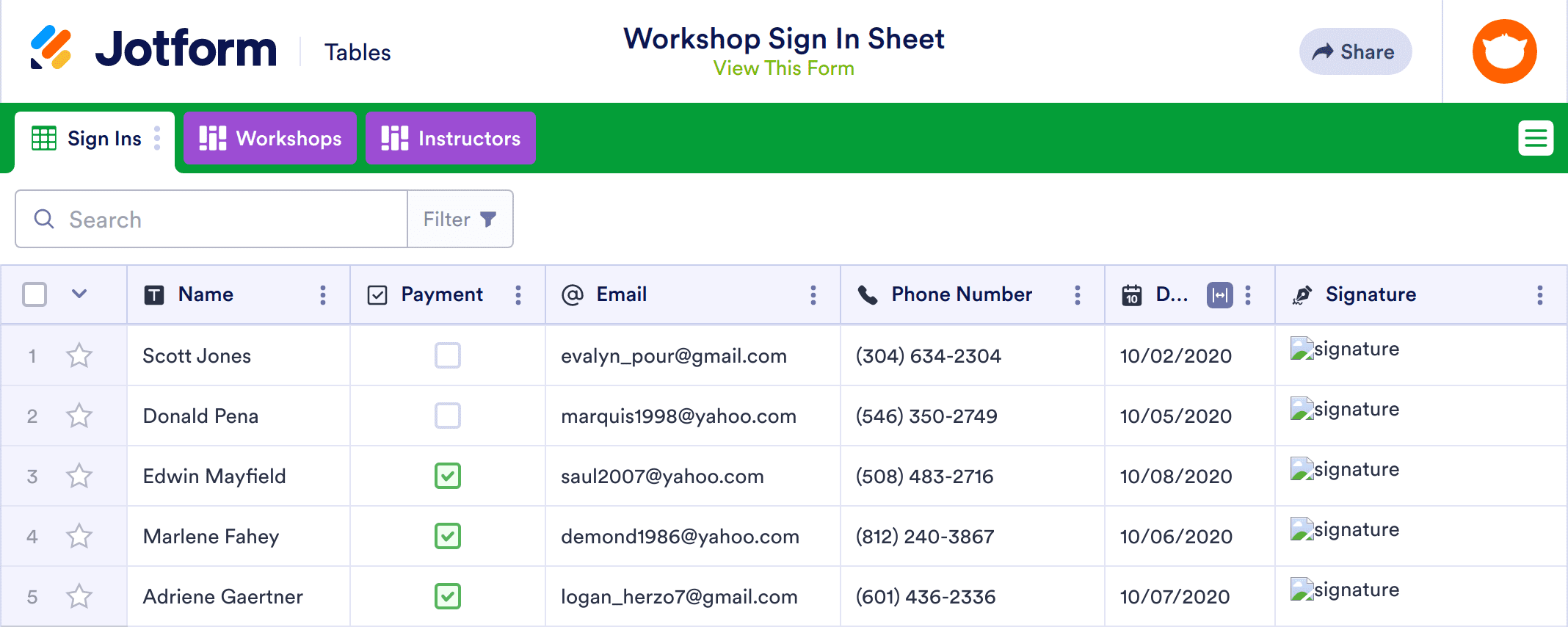 Customize your online Workshop Sign In Sheet with no coding — just add more columns to monitor payment status, use extra tabs for workshop instructor information, and automatically calculate totals with formulas. With this all-in-one database, you can manage the whole workflow of your workshop in a secure online Jotform account! No matter the topic of your workshop, this Workshop Sign In Sheet template can help you stay organized and host a memorable workshop.
