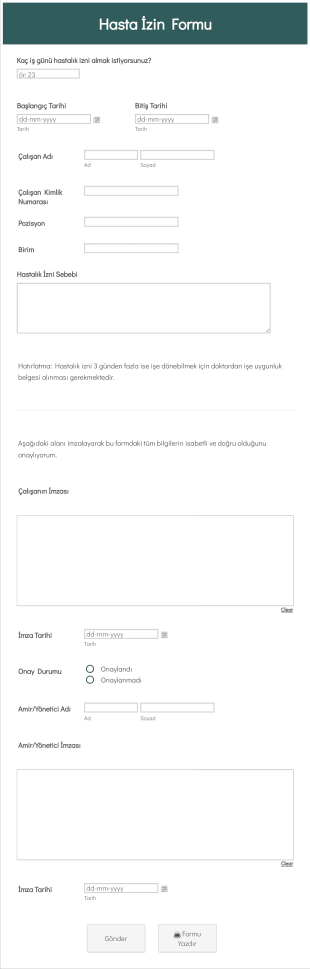 Bu AI Asistanı, çalışanların hastalık izni başvurularını toplamak için gerekli bilgileri alır. Başvuru sırasında, çalışanların adları, kimlik numaraları, izin başlangıç ve bitiş tarihleri gibi bilgileri toplayarak, bu bilgileri merkezi bir sistemde saklar. Ayrıca, çalışanların imza ve onay durumlarını da kaydetmek için gerekli alanlar mevcuttur. Jotform’un özelleştirilebilir yapısı sayesinde, asistanın görünümünü ve davranışlarını iş yerinin ihtiyaçlarına göre ayarlamak mümkündür.
