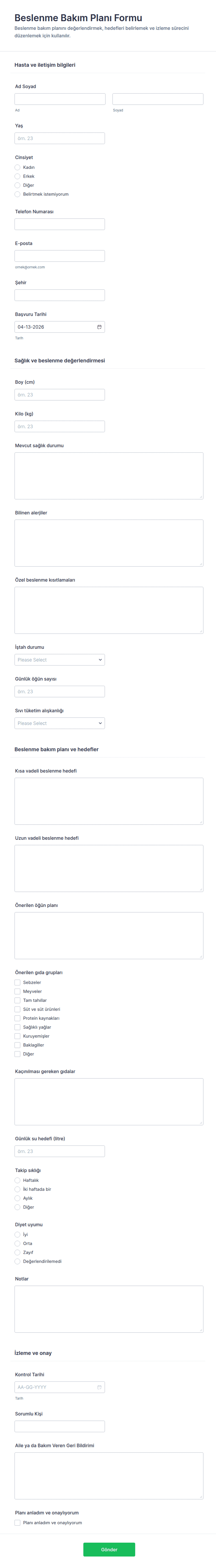 Diyetisyen formu, beslenme uzmanlarının kişiselleştirilmiş beslenme danışmanlığı için müşteri bilgilerini, beslenme alışkanlıklarını, sağlık geçmişini ve ilerlemelerini toplamak ve yönetmek amacıyla kullandıkları dijital bir belgedir.