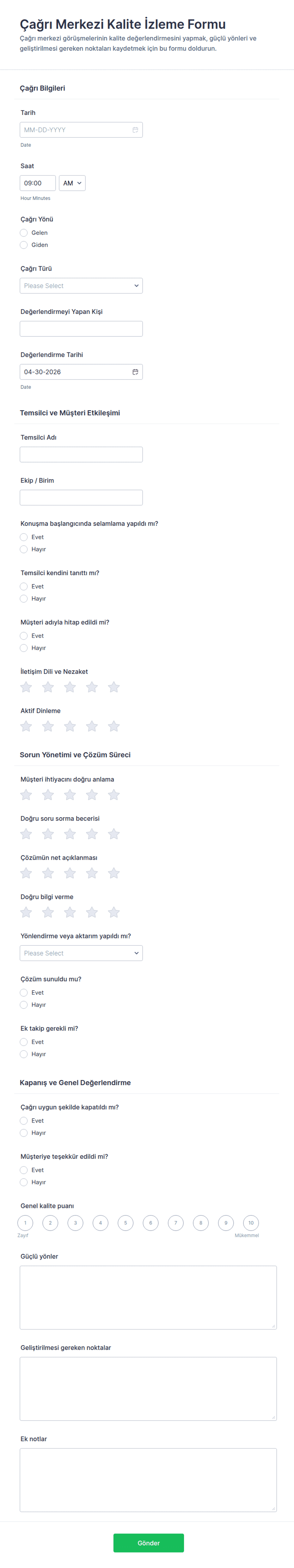 Çağrı Merkezi Kalite İzleme Formu ile çağrı değerlendirmelerini tek yerden toplayın, temsilci performansını puanlayın ve iyileştirme alanlarını raporlamaya uygun şekilde takip edin.