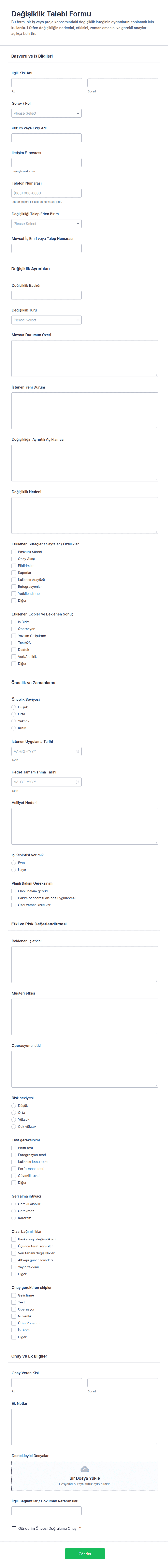 Bu adımları takip ederek, kuruluşunuzun değişiklik yönetimi süreçlerini kolaylaştıran, hataları azaltan ve her talebin verimli bir şekilde ele alınmasını sağlayan özelleştirilmiş bir Düzenleme Talep Formu oluşturabilirsiniz.