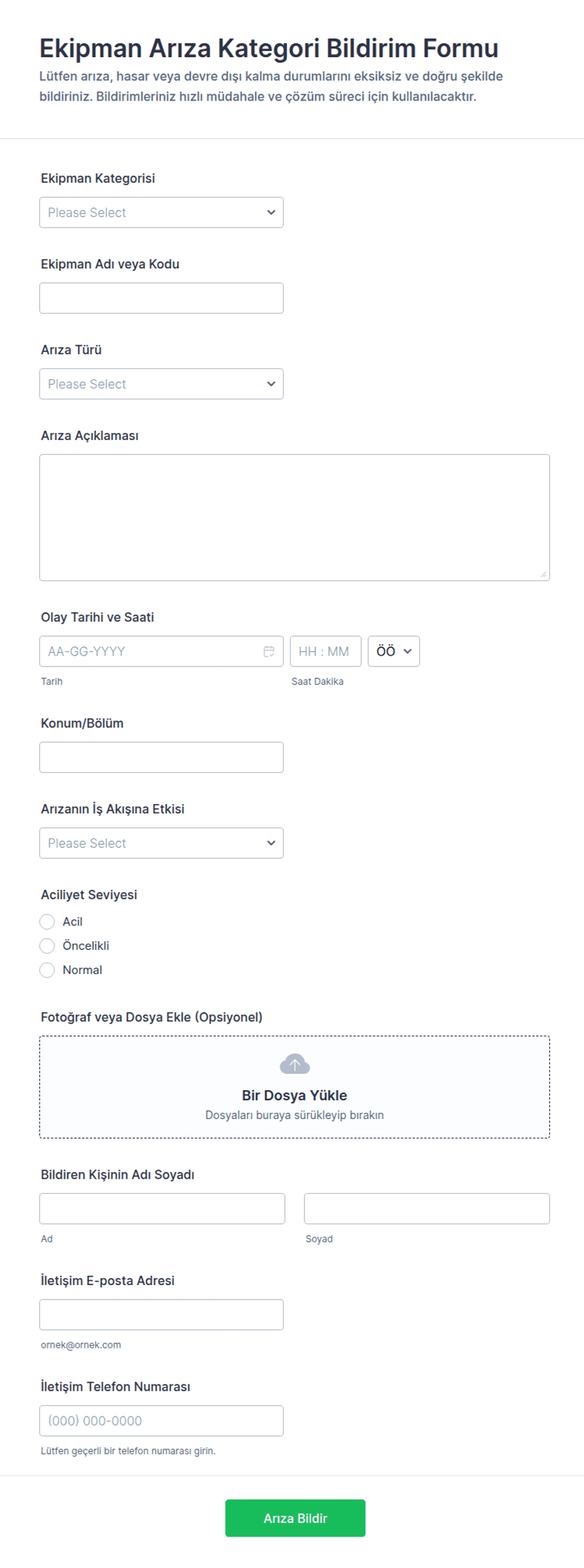 - Ekipman bakım talep formları ekipman kimliği, sorun açıklaması, önem derecesi, operasyonlar üzerindeki etkisi ve tercih edilen servis zamanlamasına odaklanır.