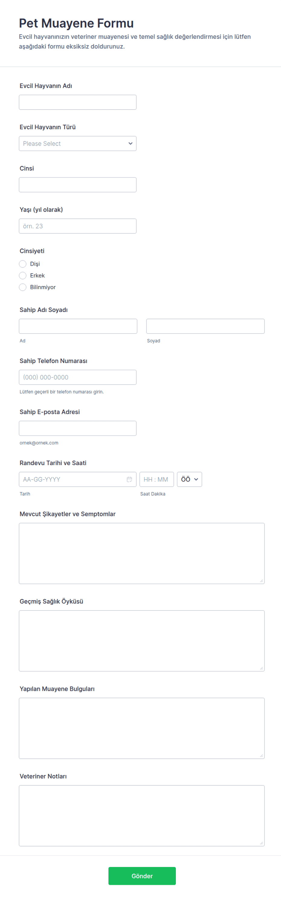Veteriner klinikleri, hayvan hastaneleri, gezici veteriner hizmeti veren ekipler ve pet bakım merkezleri bu form şablonunu randevu yönetimi ve hasta kayıtlarının düzenlenmesi için kullanabilir.