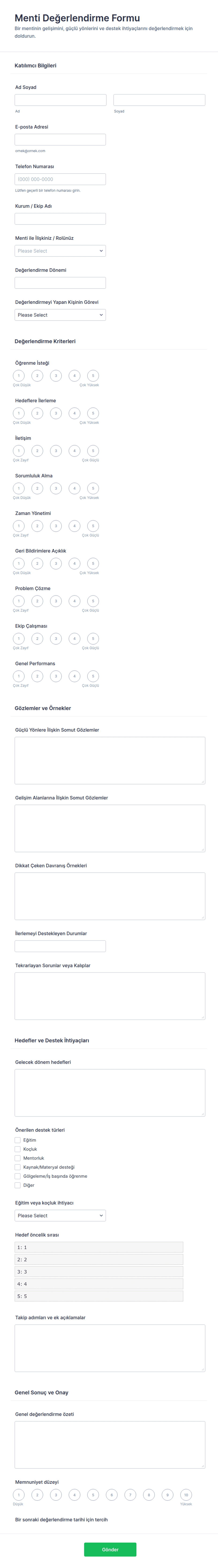 Kesinlikle. Değerlendirme formları, geri bildirimin kapsamlı bir görünümünü sağlamak üzere hem nicel alanlar (derecelendirme ölçekleri gibi) hem de nitel alanlar (açık uçlu yorumlar gibi) içerebilir.
