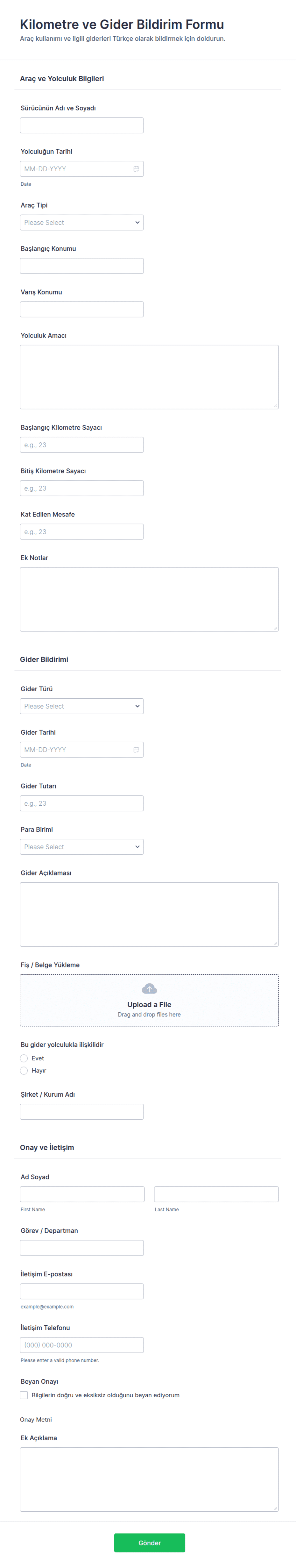 Gider Takip Formları, bireylerin, işletmelerin ve kuruluşların harcamalarını sistematik olarak kaydetmelerine, kategorize etmelerine ve izlemelerine yardımcı olmak için tasarlanmış özel dijital araçlardır. Bu formlar bütçelerin yönetilmesi, çalışanların masraflarının geri ödenmesi, proje maliyetlerinin takibi ve finansal şeffaflığın sağlanması için gereklidir. Yaygın kullanım alanları arasında çalışan masraf geri ödemeleri, seyahat ve eğlence giderlerinin kaydı, departman bütçe takibi ve küçük işletme gider yönetimi yer alır. Her bir giderin tarih, tutar, kategori ve amacı gibi detaylarını kaydetmek için yapılandırılmış bir yöntem sunarak, finansal kayıt tutma ve raporlama sürecini kolaylaştırır.