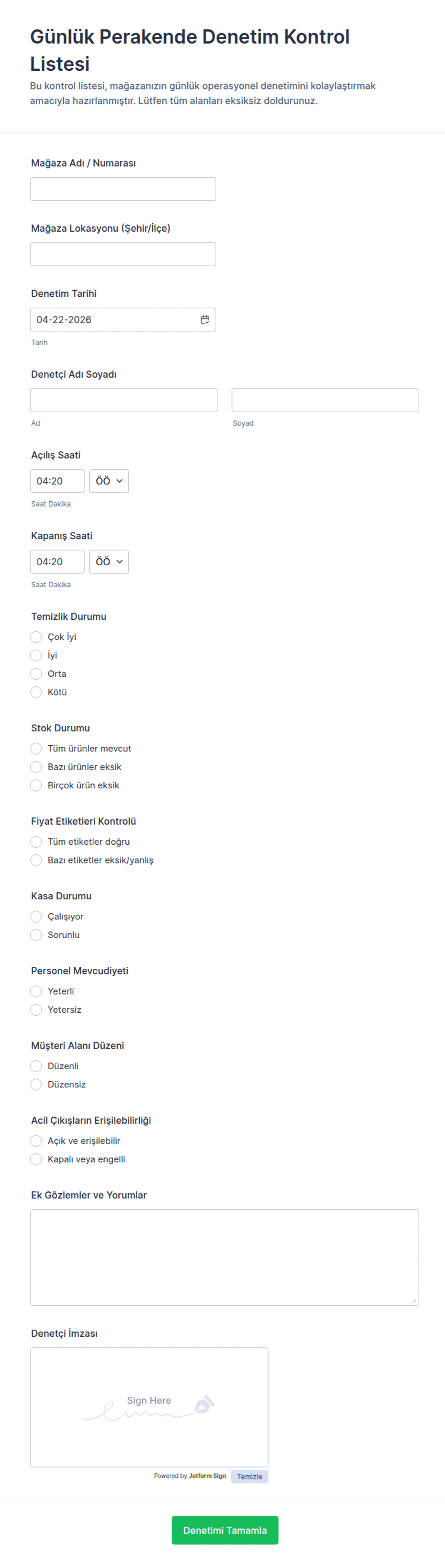 - Güvenlik kontrol listeleri konum, tarih, denetçi adı ve yorumlar için alanlar içerebilir