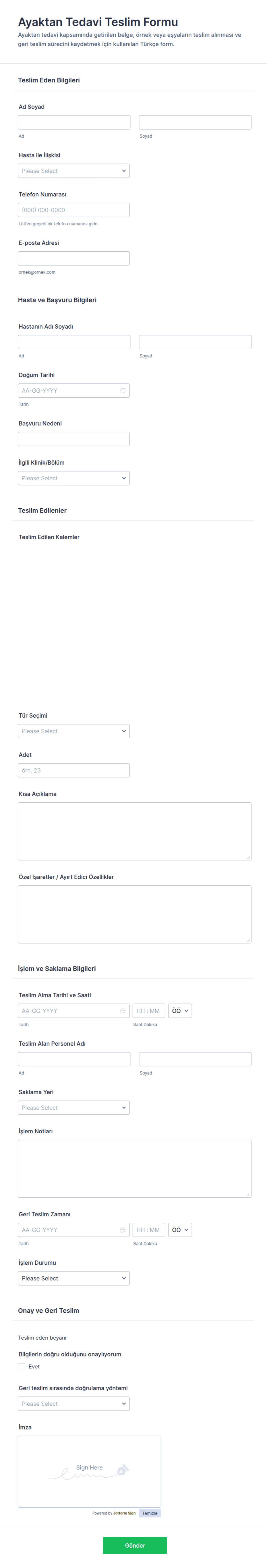 Ayaktan Tedavi Teslim Formu, hastaya ait teslim edilen eşyaların ve işlem sürecinin kayıt altına alınmasına yardımcı olur ve klinikler, poliklinikler ile hasta kabul ekipleri için veri toplama sürecini kolaylaştırır.