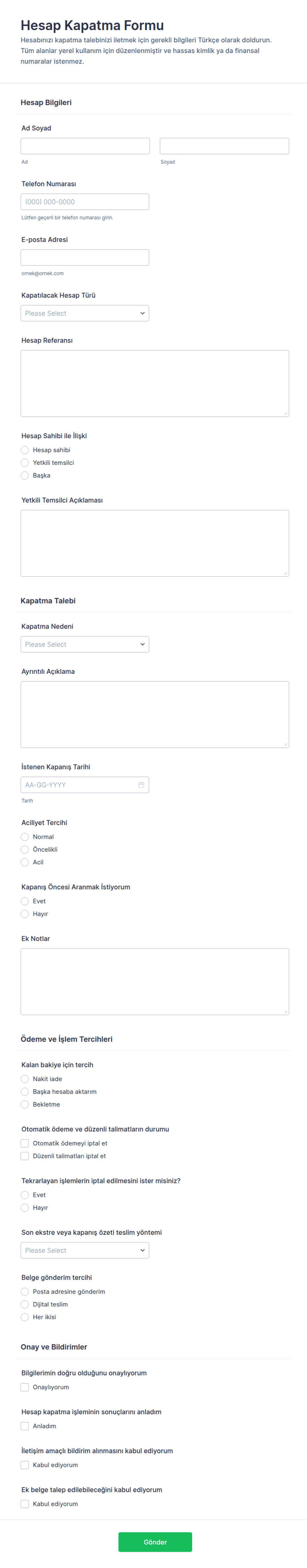 Hesap Sonlandırma Formu, kullanıcıların hesap kapatma taleplerini ve tercih edilen sonlandırma tarihini online olarak toplamak isteyen müşteri hizmetleri ve üyelik yönetimi ekipleri için pratik bir çözümdür.