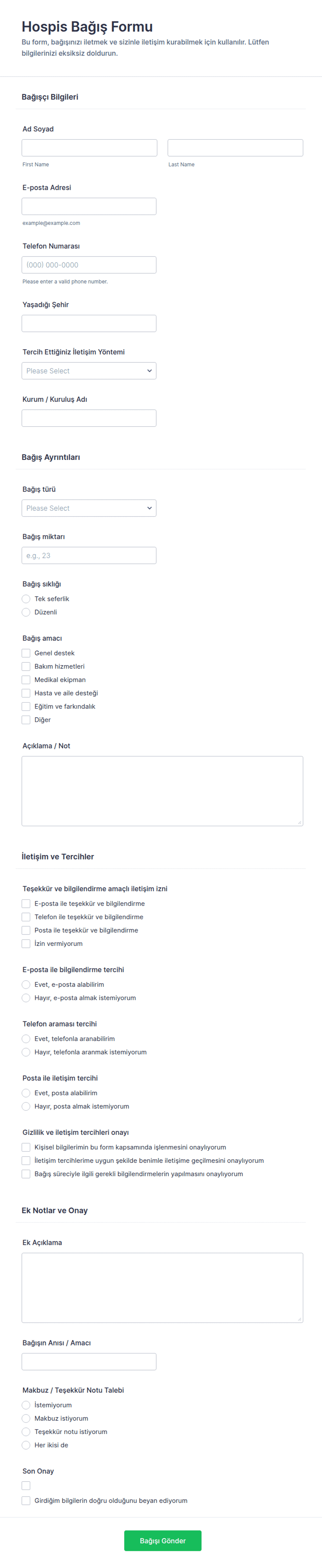 Bakımevi ve palyatif bakım için hastaları kaydetmek amacıyla ücretsiz Bakımevi Formlarımızı kullanın. İster bireysel bir kullanıcı olun ister bir sağlık hizmeti sağlayıcısı, güvenli online formlarımız, iletişim bilgileri, e-imzalar, dosya yüklemeleri, sağlık verileri ve COVID-19 tarama bildirimleri gibi önemli hasta bilgilerini hızlıca toplamanızı sağlar. Tüm yanıtlar Jotform hesabınızda depolanır ve 256-bit SSL bağlantısı, PCI uyumluluğu ve isteğe bağlı HIPAA uyumlu özellikler ile korunur.