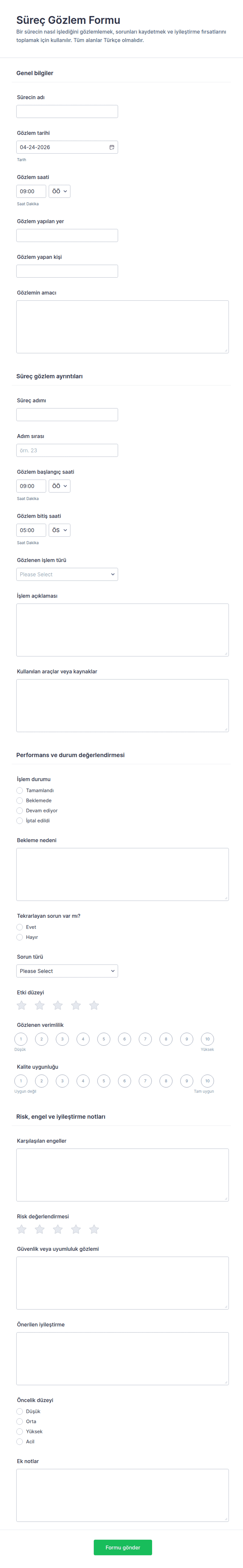 Bu adımları takip ederek, herhangi bir izleme senaryosunda veri toplama sürecini kolaylaştıran, doğruluğu artıran ve proaktif karar vermeyi destekleyen bir İzleme Formu oluşturabilirsiniz.