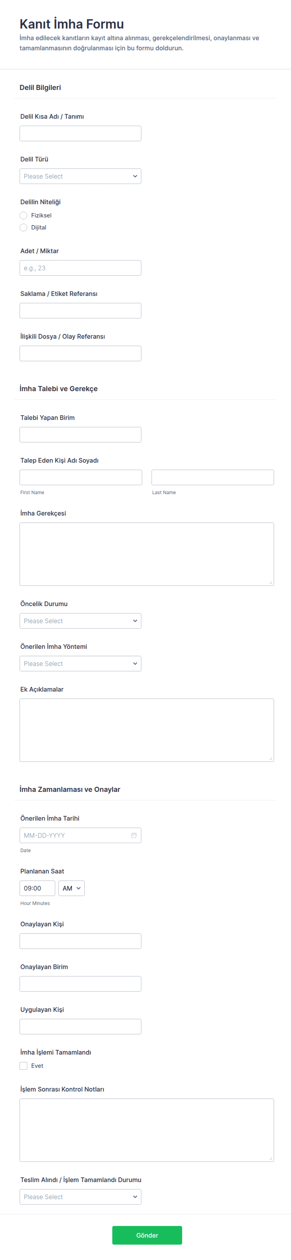 Kanıt İmha Formu ile kurum içi delil imha taleplerini onay ve zamanlama süreciyle birlikte kayda alın, veri toplama ve her form yanıtını tek yerde takip ederek ekipler arası koordinasyonu kolaylaştırın.