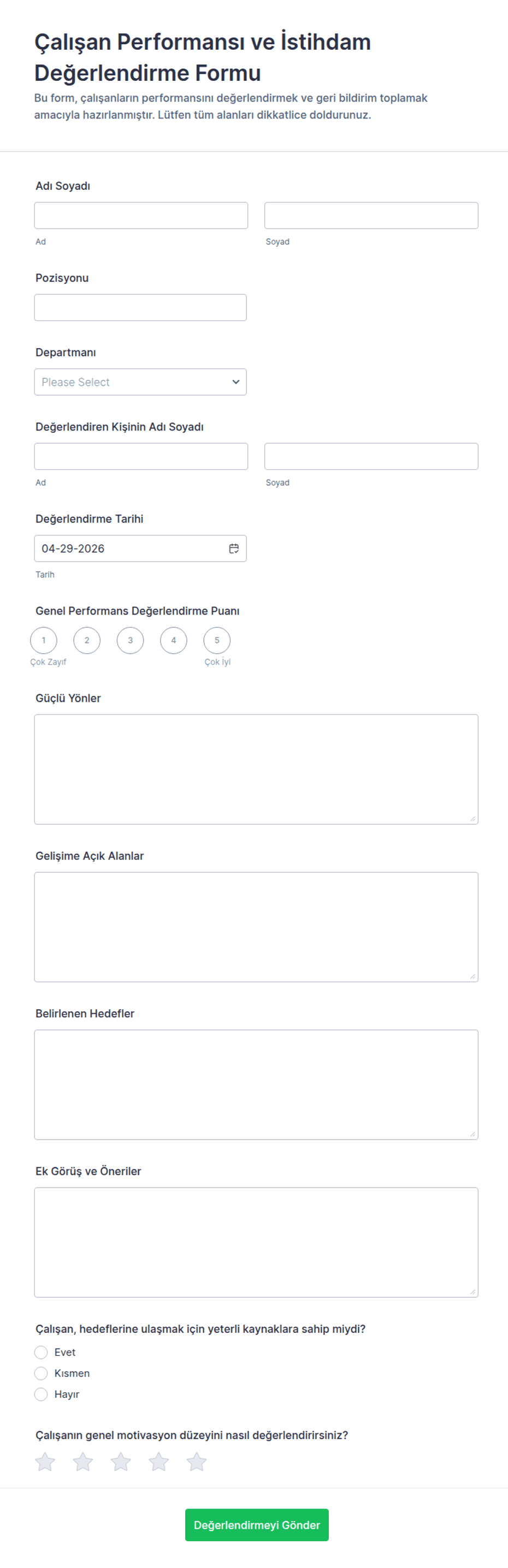 Çalışan değerlendirme formu; çalışanların becerileri, hedefleri ve başarıları hakkında bilgi toplayarak çalışanların ilerlemesini izlemek için kullanılan bir performans değerlendirme aracıdır. Ücretsiz Çalışan Değerlendirme Formu şablonlarımızla, çalışanlarınızın neleri iyi yaptığını kolayca görmek ve iyileştirme alanlarını belirlemek için yanıtları online olarak toplayabilirsiniz. Çalışan değerlendirmelerinizi bilgisayarınızdan veya mobil cihazınızdan yaptıktan sonra, Jotform hesabınızda güvenli bir şekilde saklanacaktır, bu da değerlendirmeleri yönetmeyi ve yazdırılabilir PDF'lere dönüştürmeyi kolaylaştırır!
