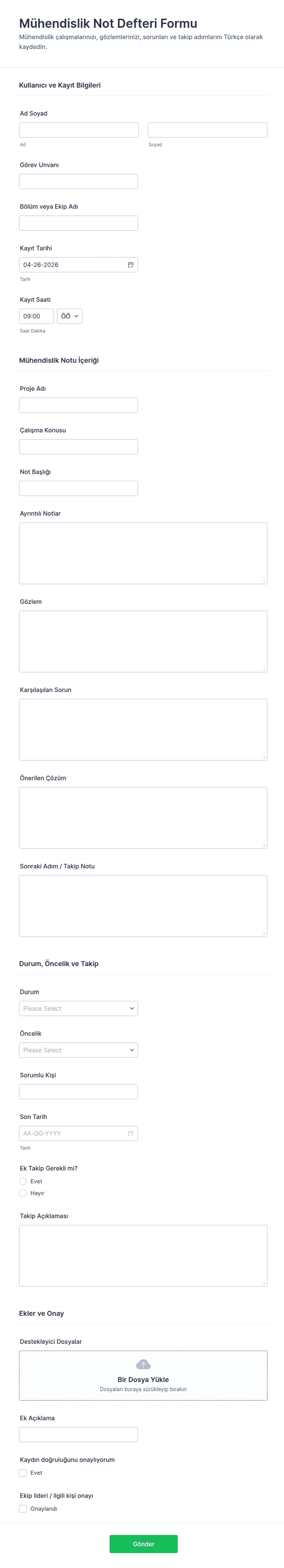 Mühendislik formu, mühendislik profesyonelleri tarafından denetimler, bakım, ilerleme raporları ve uyumluluk kontrol listeleri gibi projeyle ilgili verileri toplamak, kaydetmek ve yönetmek için kullanılan dijital bir belgedir.