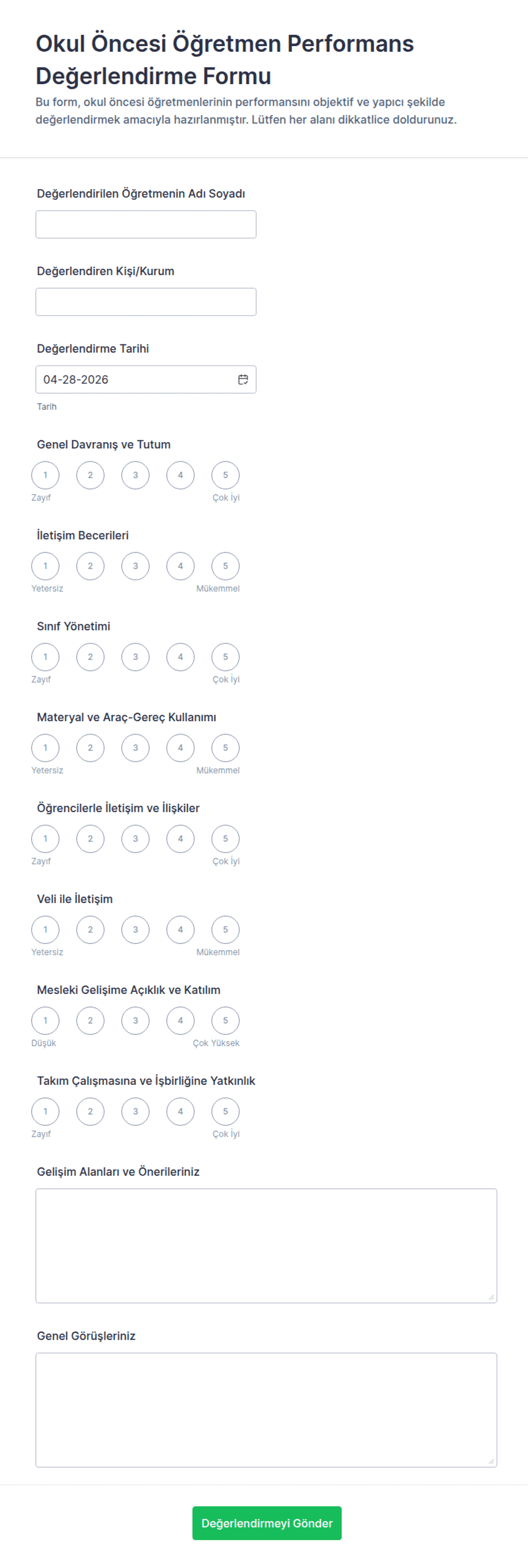 Bu adımları takip ederek, eğitim topluluğunuzda sürekli gelişim ve profesyonel ilerlemeyi destekleyen, hem kapsamlı hem de kullanımı kolay bir Öğretmen Değerlendirme Formu oluşturabilirsiniz.