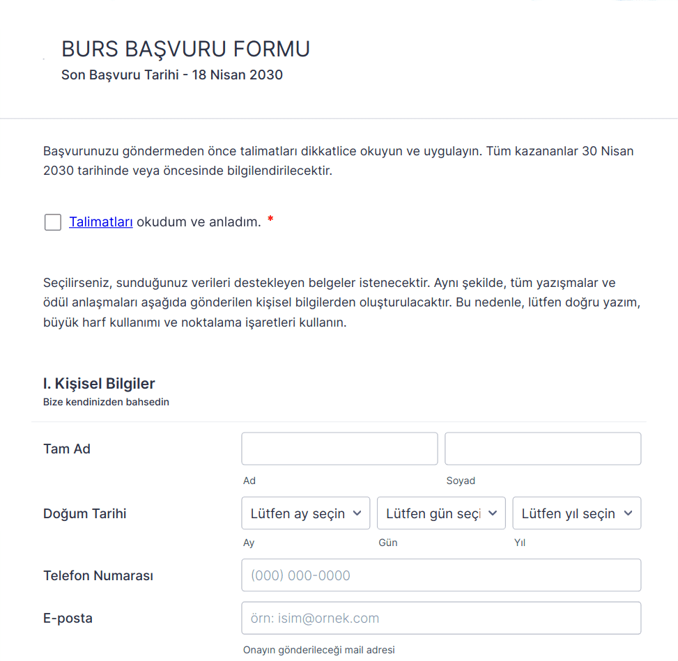 Bu adımları takip ederek, veri toplamayı kolaylaştıran, başvuru sahibi deneyimini geliştiren ve inceleme sürecinizi düzenleyen özelleştirilmiş bir başvuru formu oluşturabilirsiniz - kodlama gerekmez.