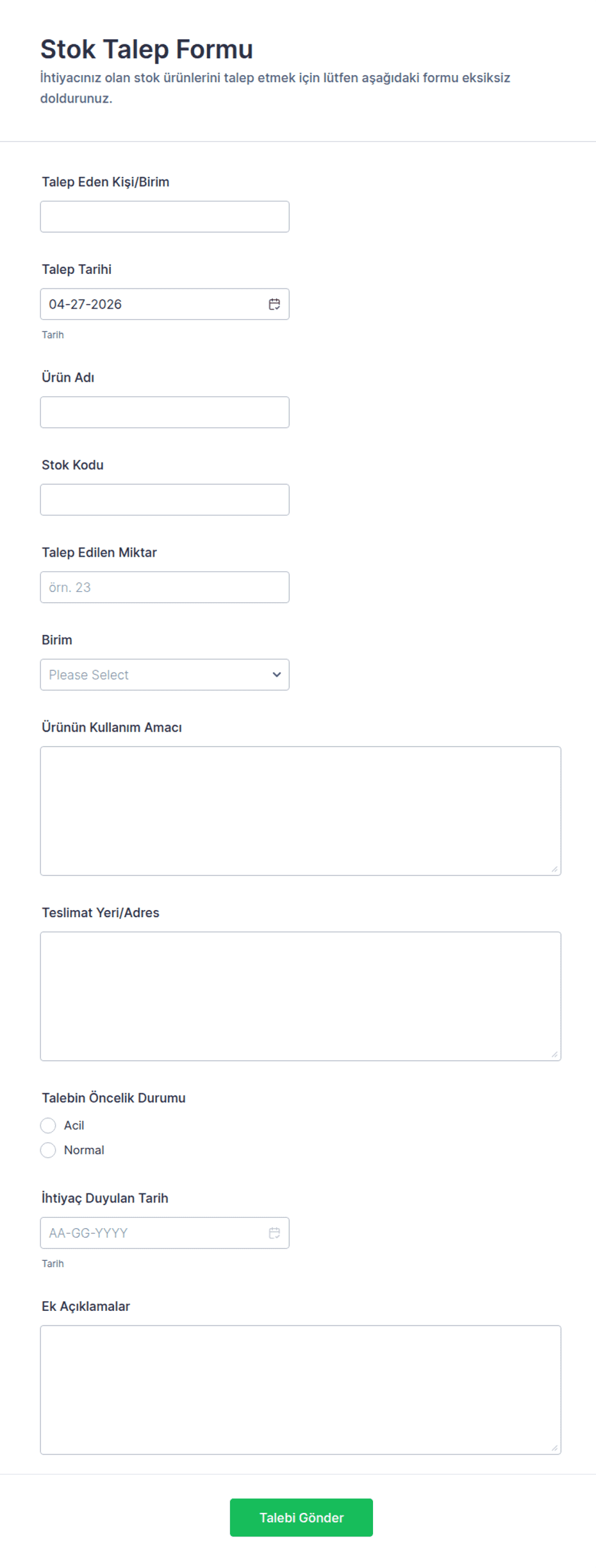 Evet, formlar kurum içi talepler, tedarikçi siparişleri, hizmet sözleşmeleri, envanter yenileme ve kurumsal ihtiyaçlara bağlı olarak daha fazlası için özelleştirilebilir.